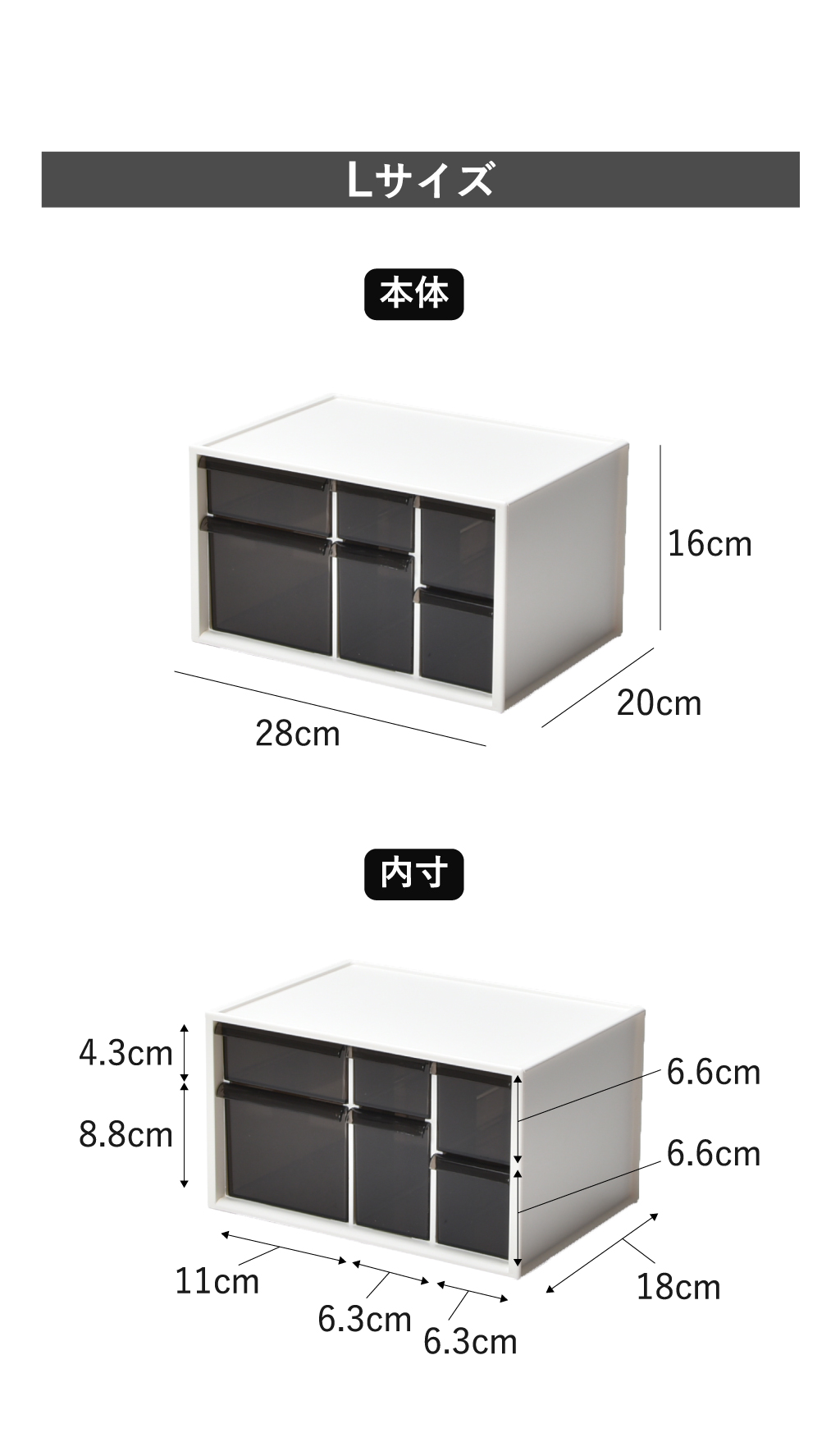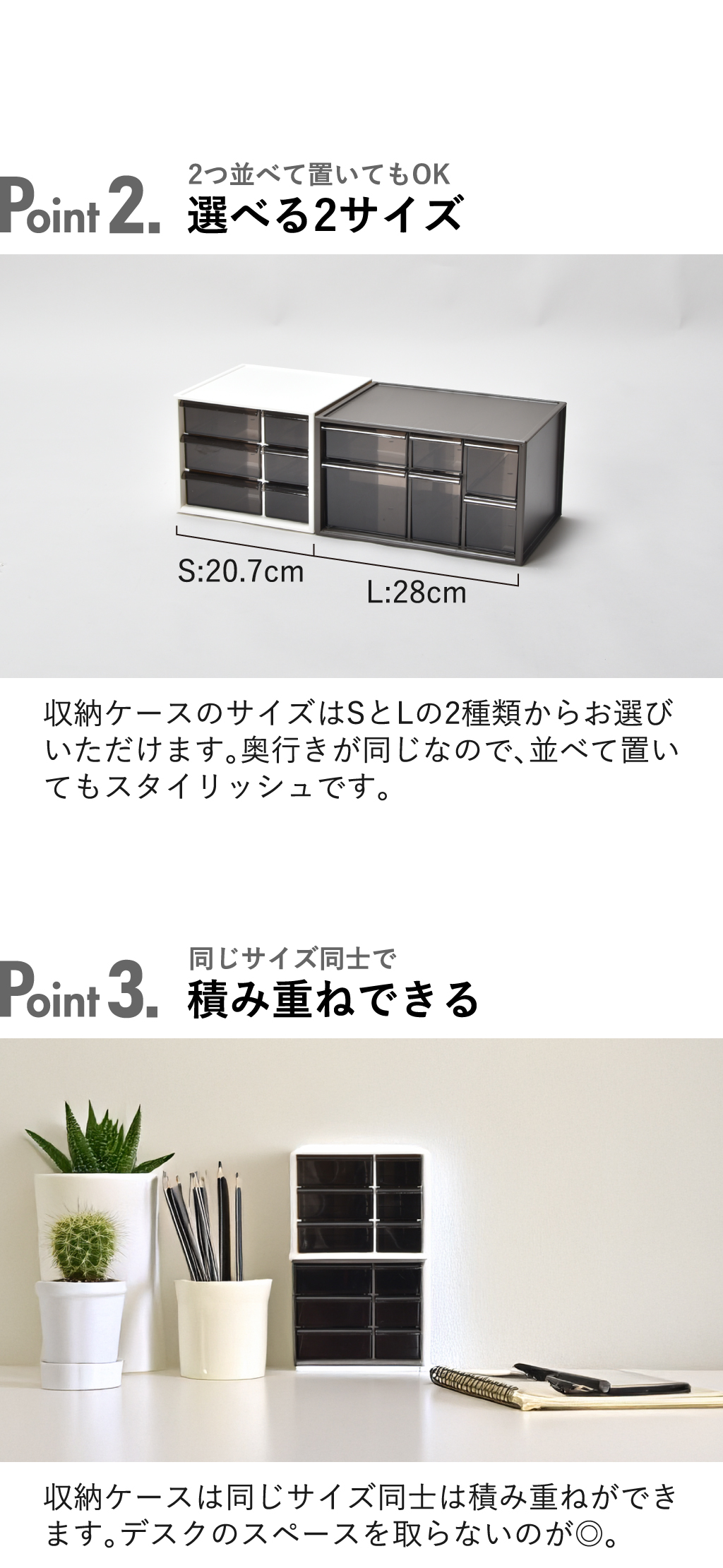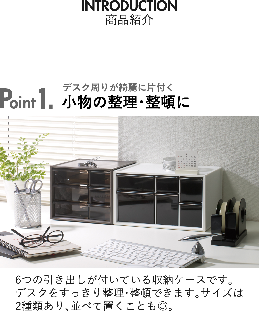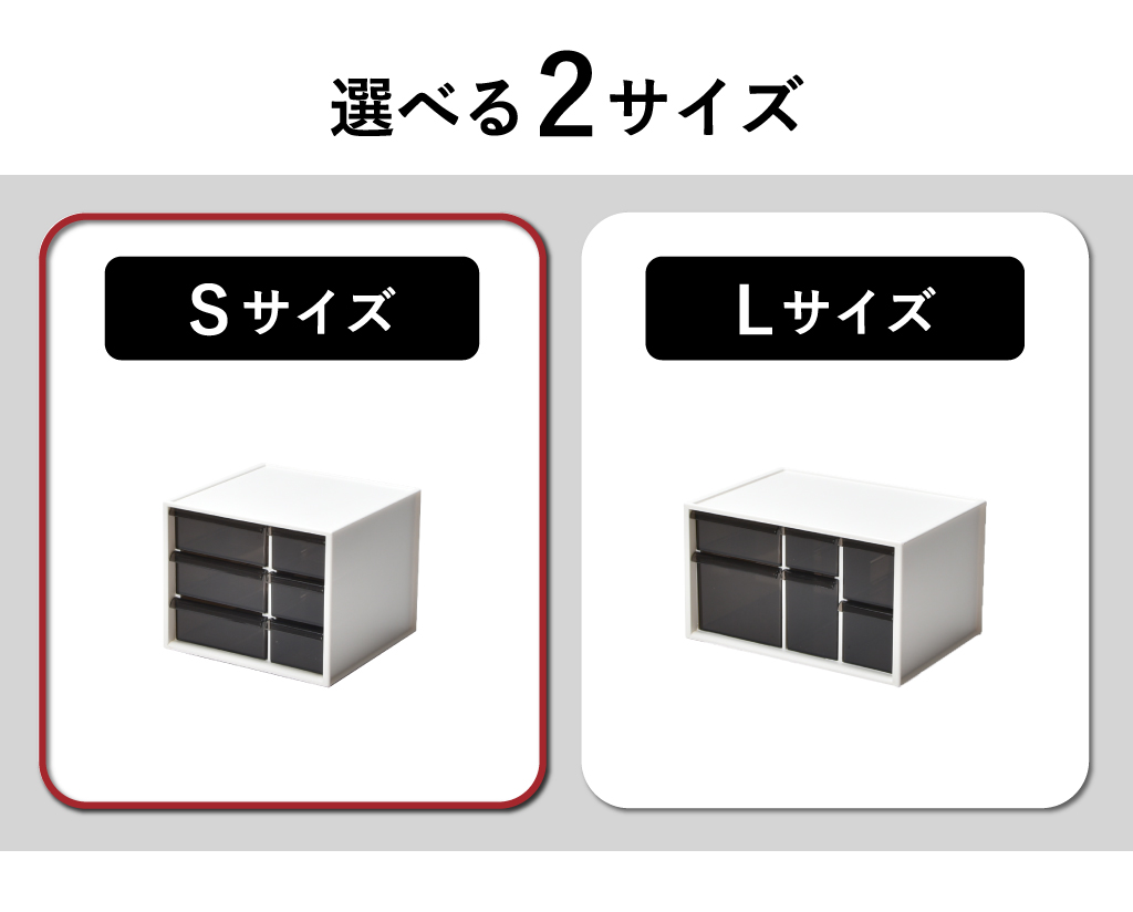 デスク周りの小物の整理に便利なメガネ収納ケースです。メガネ収納ケースには6つの引き出しが付いているので、種類ごとに分けて収納できます。薬や化粧品の収納にも便利です。引き出しはペンやハサミなどの長さのあるものでも入る奥行きがあります。引き出しの持ち手は開閉しやすい形になっているので、スムーズに引き出せます。クリアになっているので、中になにが入っているか一目で分かります。メガネ収納ボックスのサイズはSとLサイズがあります。サイズ違いで並べて置いてもスタイリッシュです。同じサイズ同士は積み重ねができるので、デスクのスペースを取りません。