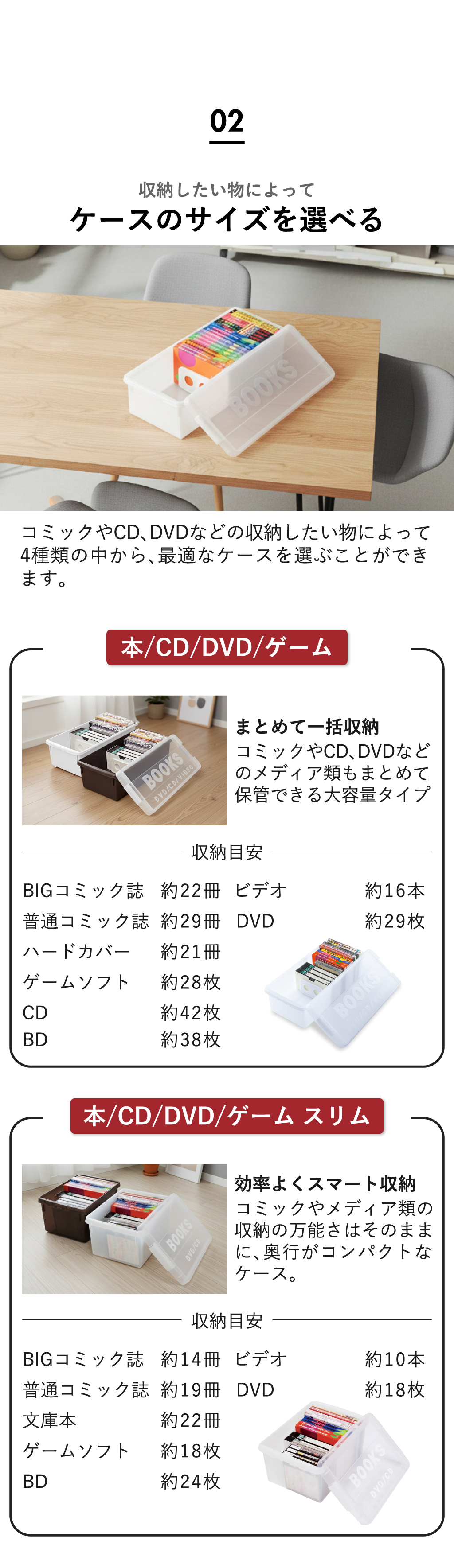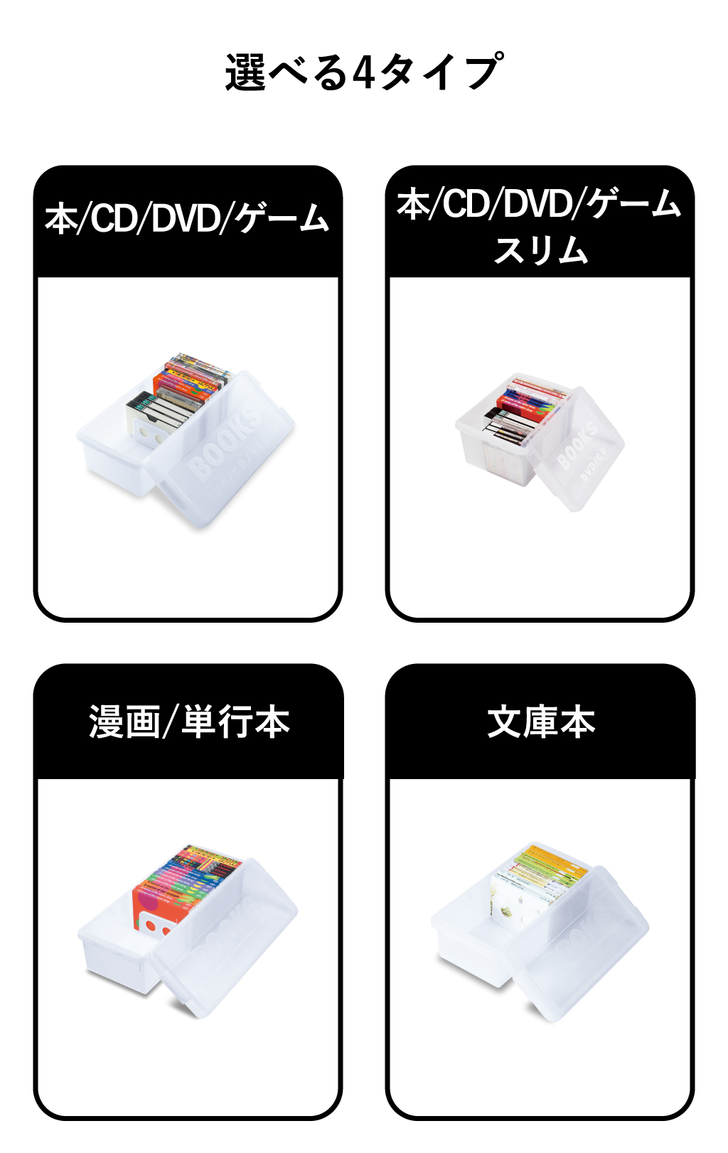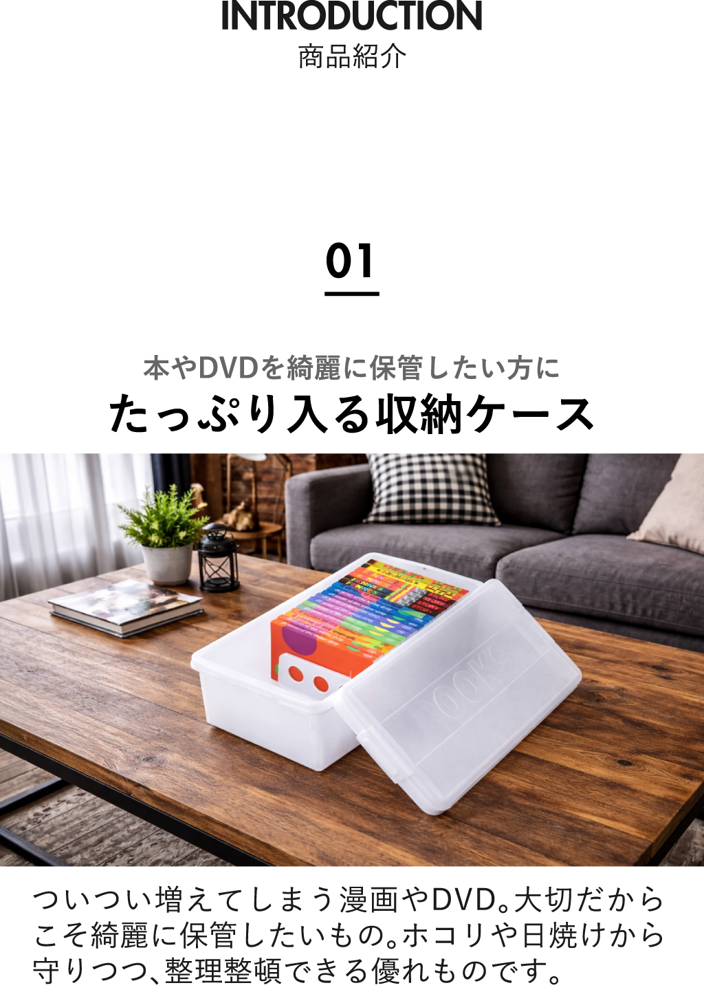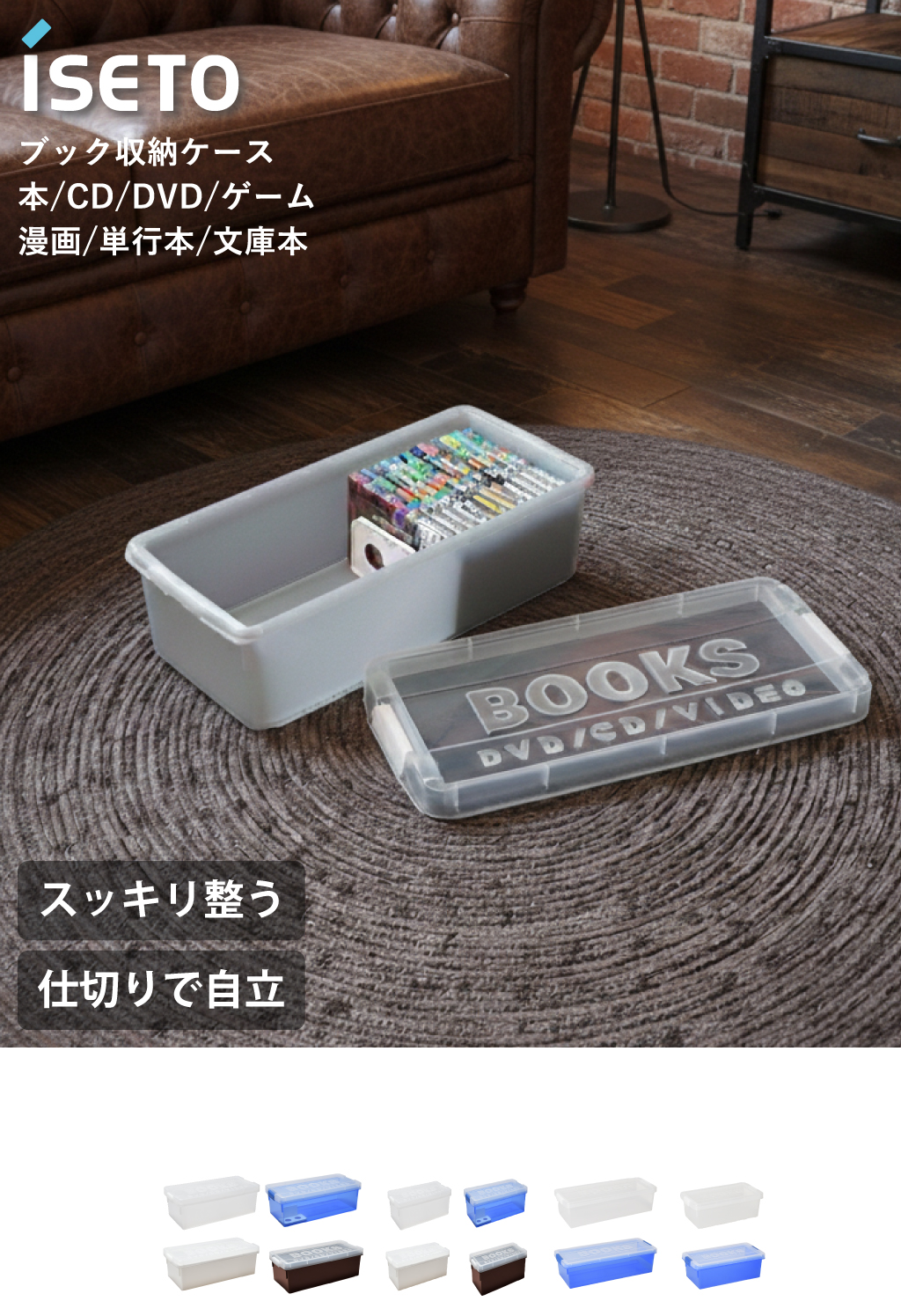 いつの間にか増えてしまう本・DVD・CD・ゲームソフトなどのコレクション。ホコリや日焼けから守りつつ、スッキリと整理整頓できるブック収納ケースです。中身が確認しやすい透明のフタを採用したブック収納ケースなら、お目当ての作品がどこにあるか一目で判別でき、探す手間なくサッと手に取れます。可動式の仕切り板が、少ない冊数でも本をしっかり自立させ、大切な一冊の角の折れや曲がりを防いで保管。このブック収納ケースは、クローゼットやベッド下のデッドスペースにも整然と収まる設計です。保管したい物に合わせた4種のサイズ展開。同じシリーズで揃えれば、見た目も美しく心地よい統一感が完成し、お部屋をよりスッキリと整えます。