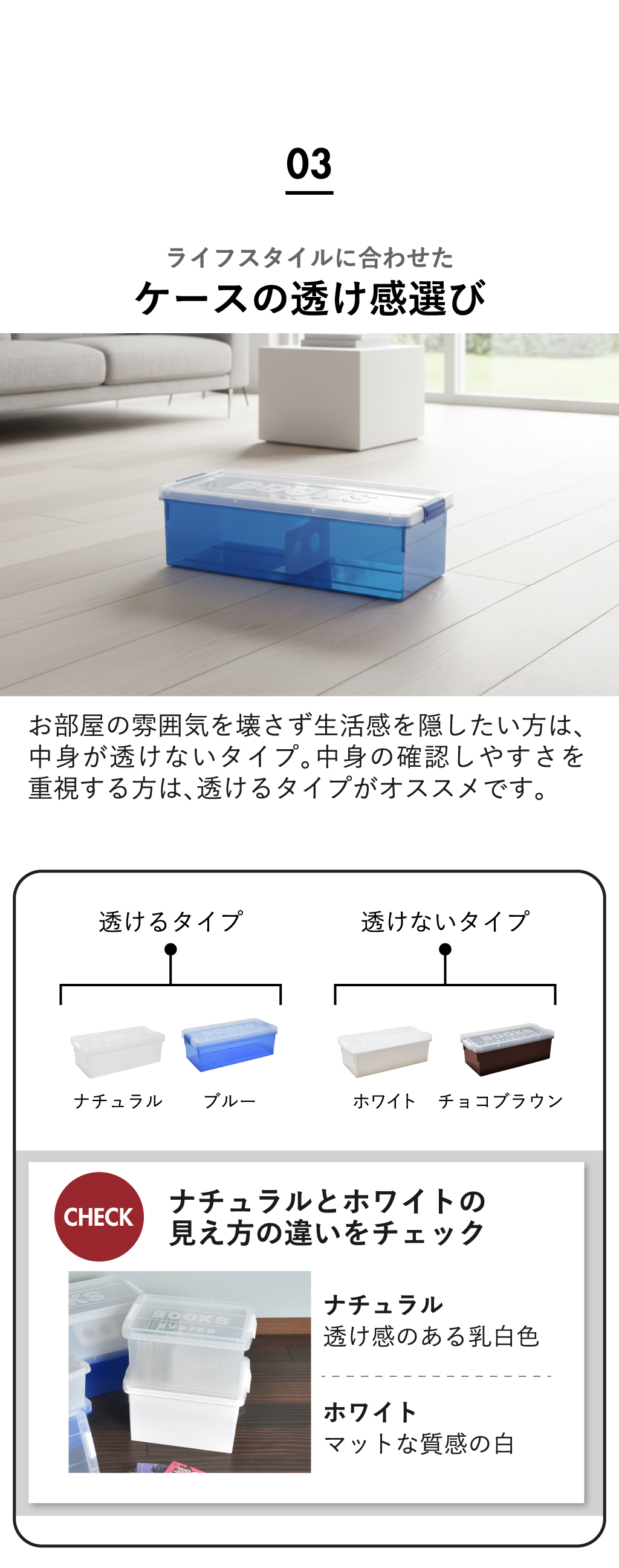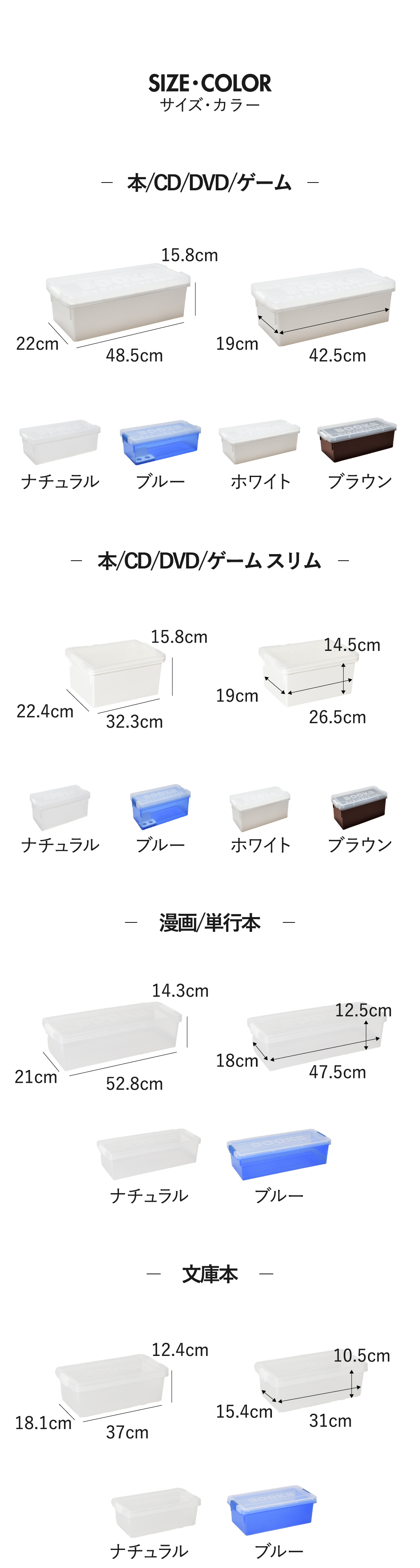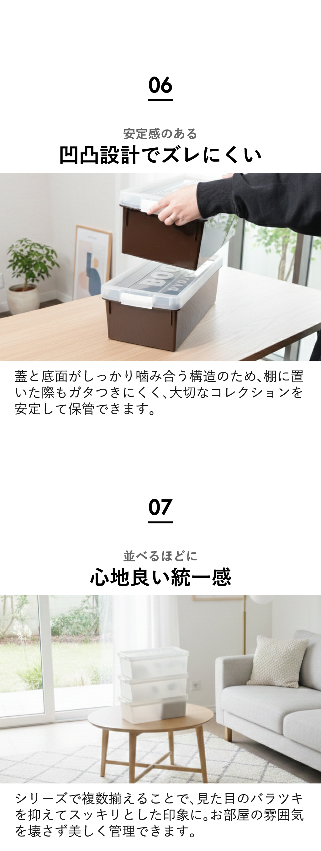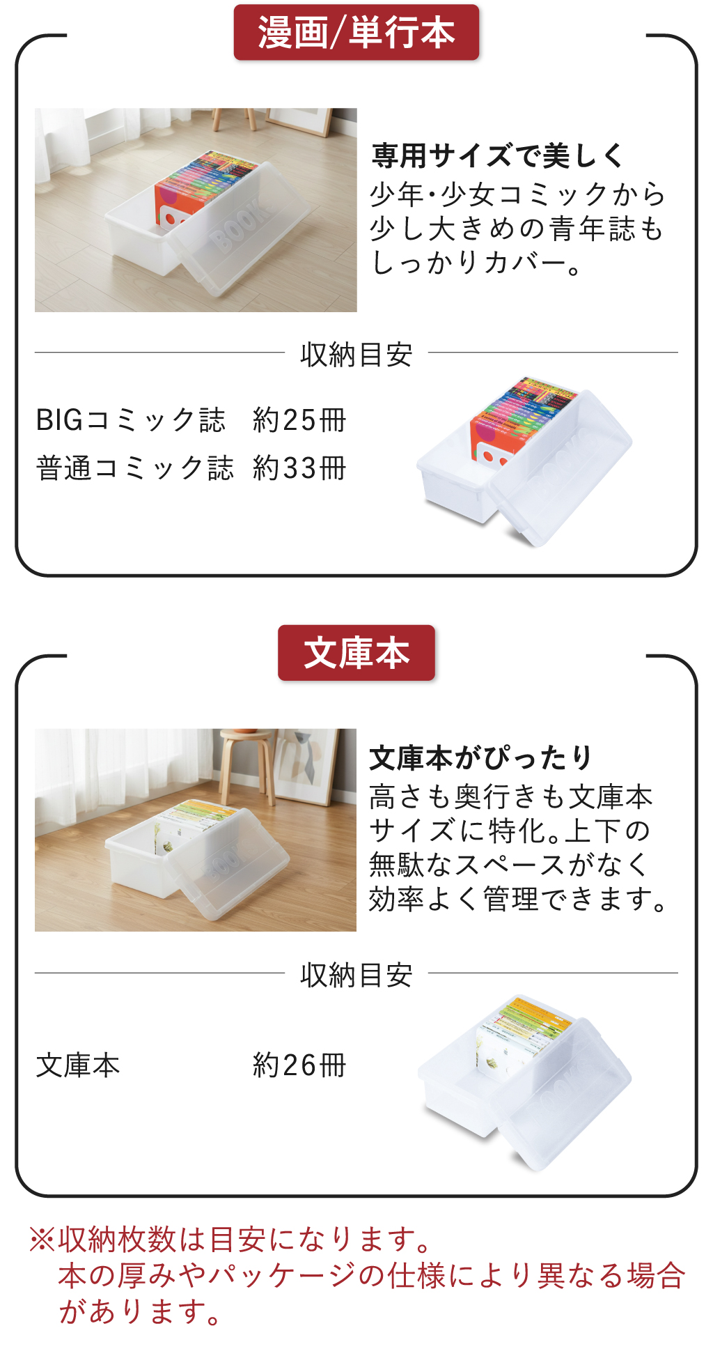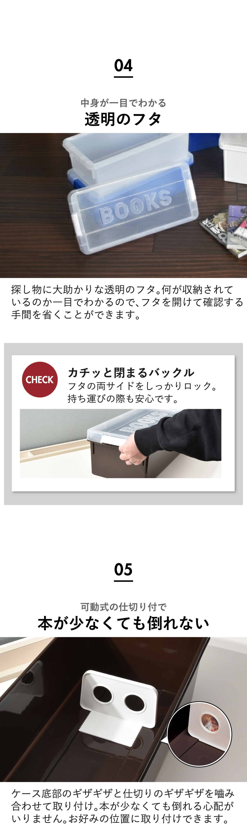 いつの間にか増えてしまう本・DVD・CD・ゲームソフトなどのコレクション。ホコリや日焼けから守りつつ、スッキリと整理整頓できるブック収納ケースです。中身が確認しやすい透明のフタを採用したブック収納ケースなら、お目当ての作品がどこにあるか一目で判別でき、探す手間なくサッと手に取れます。可動式の仕切り板が、少ない冊数でも本をしっかり自立させ、大切な一冊の角の折れや曲がりを防いで保管。このブック収納ケースは、クローゼットやベッド下のデッドスペースにも整然と収まる設計です。保管したい物に合わせた4種のサイズ展開。同じシリーズで揃えれば、見た目も美しく心地よい統一感が完成し、お部屋をよりスッキリと整えます。