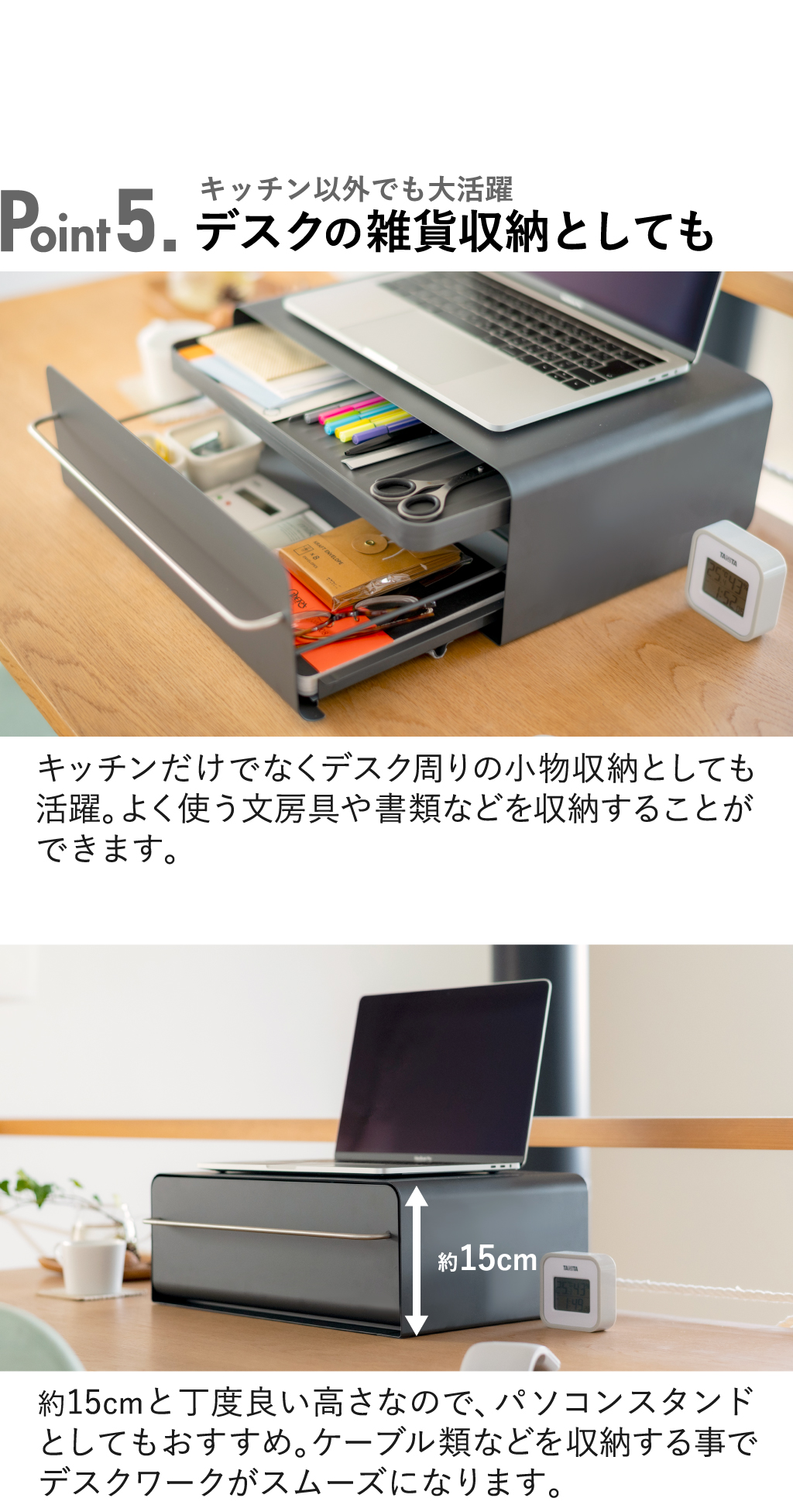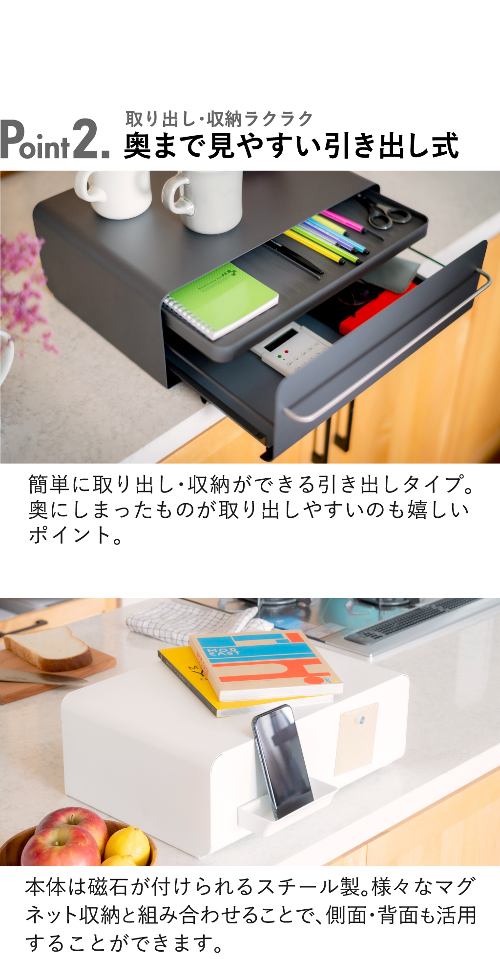 ごちゃつきがちなキッチン周りをスッキリ収納できるトースターラック。天板上はフラット仕様なのでトースターやケトルなどキッチン家電の置き場所に最適です。簡単に収納・取り出しができる引き出しタイプのトースターラック。奥までしっかり手が届くので収納もスムーズになります。中は上下2段に分けて収納できる内トレイ付き。上段には高さの出ないカトラリーやミトンなどの収納に。下段には缶詰めやマグカップなどの少し高さのあるものも収納できます。内トレイは取り外しできるので1段で広く使うことも可能です。キッチンだけでなくデスク周りの小物収納としても活躍。洗練されたシンプルなデザインで高級感を演出するトースターラック。ピュアホワイトとカームグレーの2色からお選びください。