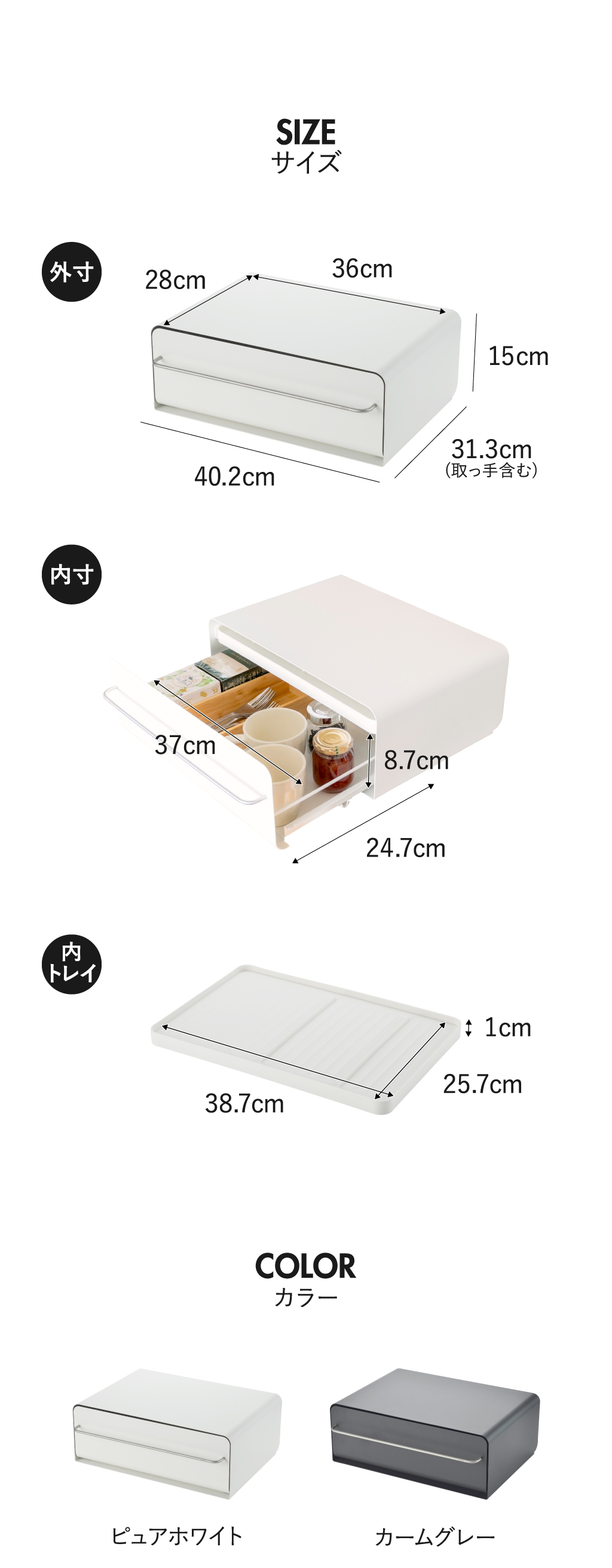 | サイズ | 外寸:約幅40.2cm×奥行き31.3cm(取っ手含む)×高さ15cm 天板有効平面:約幅36cm×奥行き28cm 内寸(引き出し):約幅37cm×奥行き24.7cm×高さ8.7cm 内寸(内トレイ):約幅38.7×奥行き25.7×高さ1cm 内寸(引き出し:内トレイ取外し時):約幅37cm×奥行き24.7cm×高さ12.8cm ※前倒れ防止ストッパーが付いているため、引き出し手前にスペースを5cm以上取れる場所に設置してください。 |