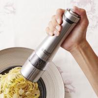 片手で簡単ワンプッシュ、ステンレスの輝きが美しい「ラッセルホブス電動ミル ソルト&ペッパー(2本入り)」のご紹介です。毎日の料理にかかせない調味料。手動のミルでは力がいるし、調理中で片手がふさがっている時はなかなか使いづらいですよね。ラッセルホブスの電動ミルなら、片手で上部のボタンを押すだけで自動で簡単に挽くことができます。上部のボタンを押している間はLEDライトが点灯されるので、手元が明るくなり、分量が見やすく暗いキッチンでも便利に使えます。粗いものから細かいものまで、好みに合わせて挽き方を自由自在に調節することができます。挽きたてだからこその新鮮な香りと風味が食欲をそそります。優れた機能だけじゃない、スタイリッシュなステンレスのデザインが、キッチンやテーブルに出しっぱなしにしても、いつもの食卓をホテルライクにおしゃれに演出します。定番の塩・コショウの組み合わせにちょうどいい嬉しい2本セットです。