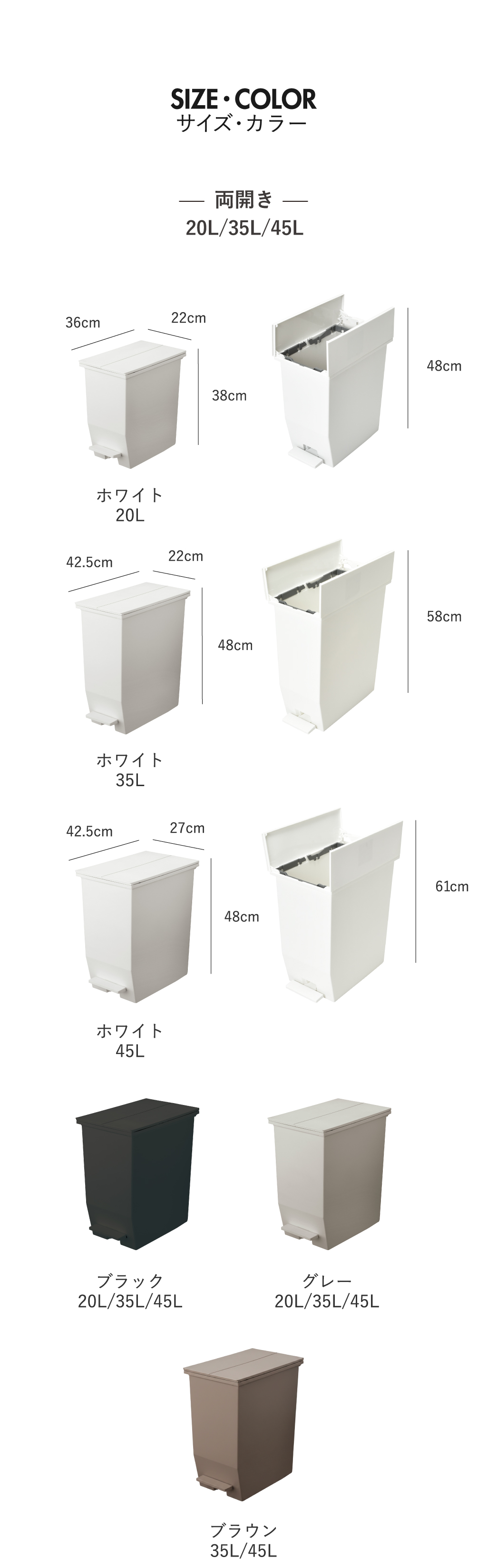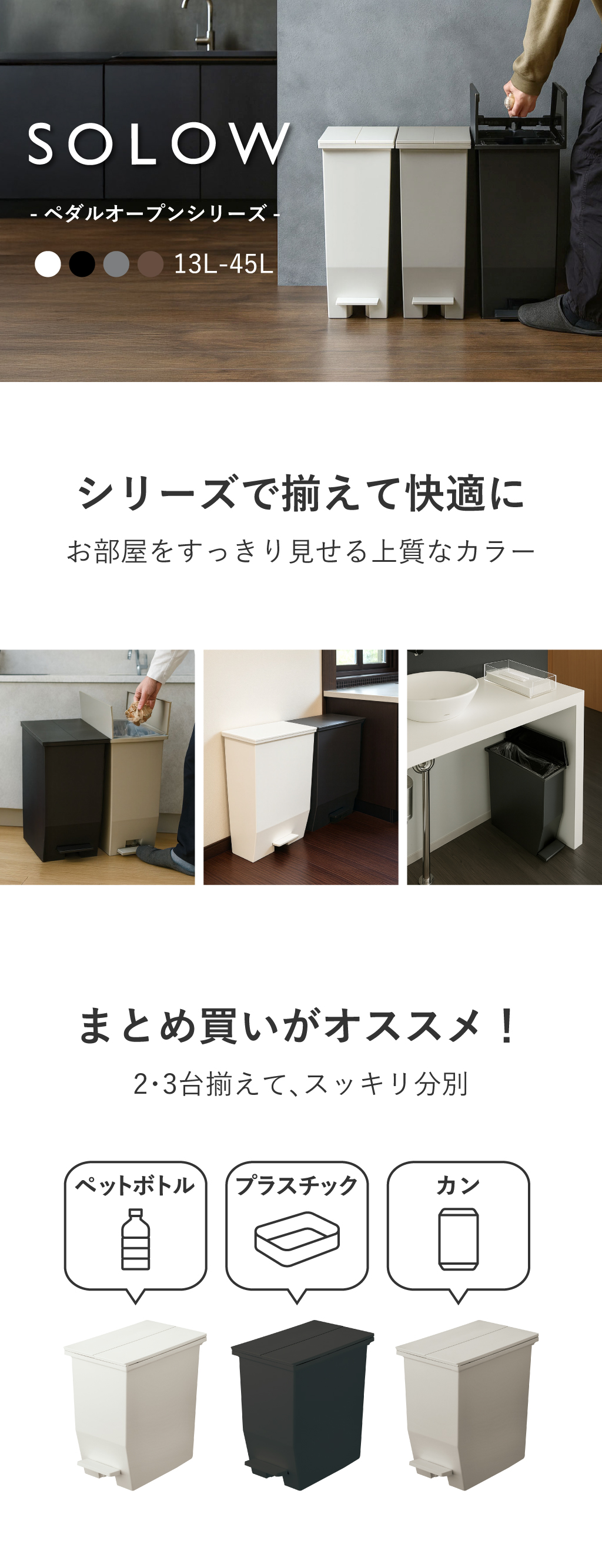 限られたスペースを有効活用できるペダル式ゴミ箱「SOLOWシリーズ」。 定番の45リットルからコンパクトな13リットルまで幅広いサイズをご用意しております。 両開き、ワイドは便利なキャスター付き。ゴミ箱にゴミが溜まって重たくなっても移動ラクラク。 フタが開いても高さが出ないので、カウンター下やパントリー下などの高さ制限がある場所に設置可能。 キャスター付きでゴミの取り換えやお掃除もスムーズ。 また、本体からはみ出さないペダル設計なので、家事導線を邪魔しません。 また、最も大きい45リットルでも省スペースに置けるサイズ感なので、これまでゴミ箱を置いていなかった場所にも設置していただけます。 ゴミ箱の開口部も広いのでスムーズにゴミ捨てができ、ニオイ漏れの心配もありません。 抗菌・防汚加工を施しているゴミ箱なので、衛生面が気になるキッチンやトイレでも使用できます。定番の「両開き」・奥行がない横長デザインの「ワイド」・コンパクトで設置場所を選ばない「スリム」の全15種類の中からお選びいただけます。