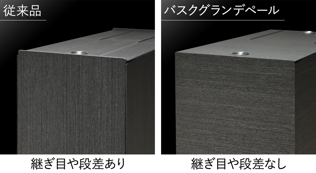 従来品は、接合部に断面部が少し見えておりましたが、グランデは接合する断面が見えない高度な接着方法を用い、横向きの木目模様と相まって継ぎ目感の少ない美しい質感になっております。邪魔になっていたフタ部分の段差も取り除き、よりスタイリッシュになっています。
