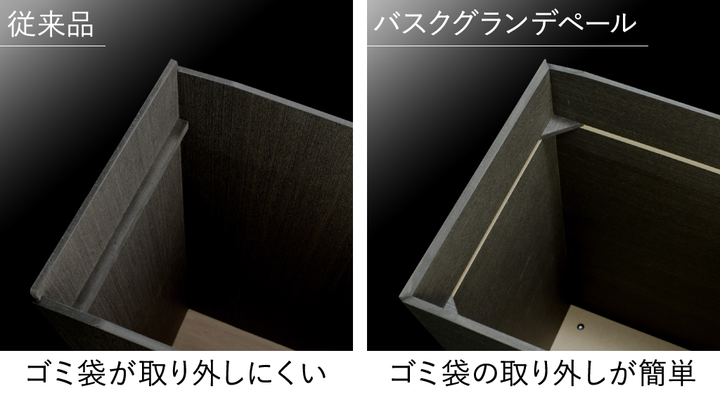 袋留めの台座形状を変更。ゴミが満タンに入った時の取り出しやすさが各段に上がりました。