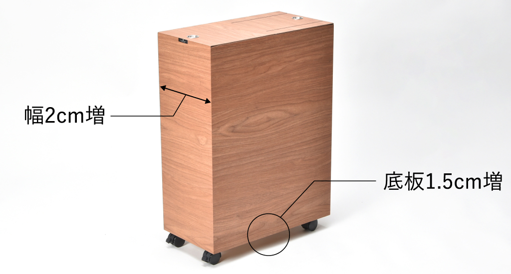 開口の幅を2cmワイド化し、大きめのゴミなども入れやすくなりました。また、底板を1.5cm厚くして強度アップと低重心化で本体が倒れるのを防止しています。