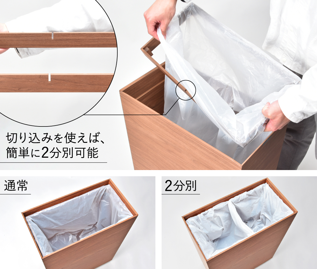 本体内部には、ゴミ袋をしっかり固定できる便利な袋留めが付属。袋を外から見えないようにセットすることで、インテリアとして空間に溶け込みます。また、袋留めには中央に切り込みが入っていて、ゴミ袋を引っ掛けて使うことで2分別ゴミ箱としてもお使い頂けます。分別する場合のゴミ袋の対応サイズは、20Lで幅50cm以上の袋になります。
