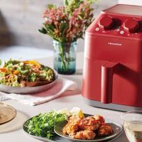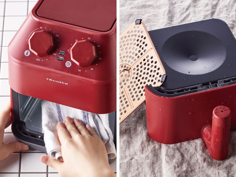 シンプルで家電と思わせないデザインのエアーオーブン。目を惹くおしゃれなレッドと、キッチンに馴染むクリームホワイトの2色からお選び頂けます。表面は光沢感のない、マットな質感で、汚れが付いたときにも拭き取りやすいです。
