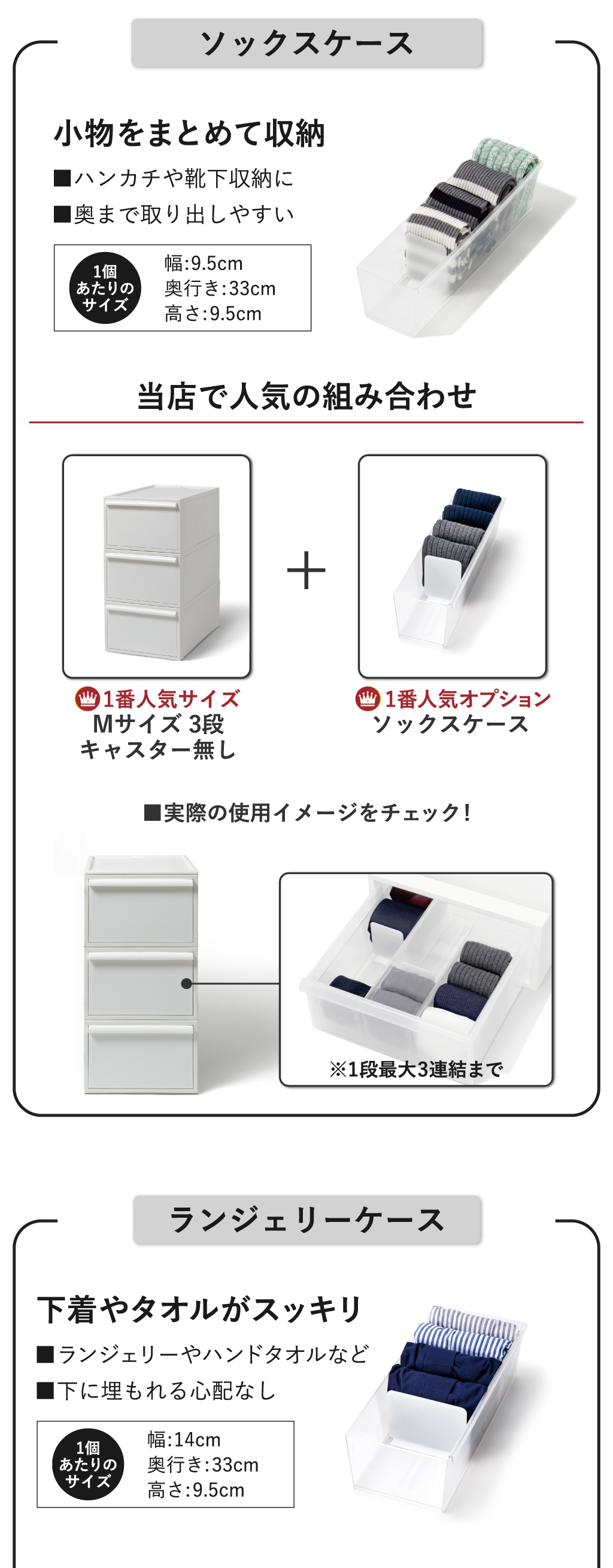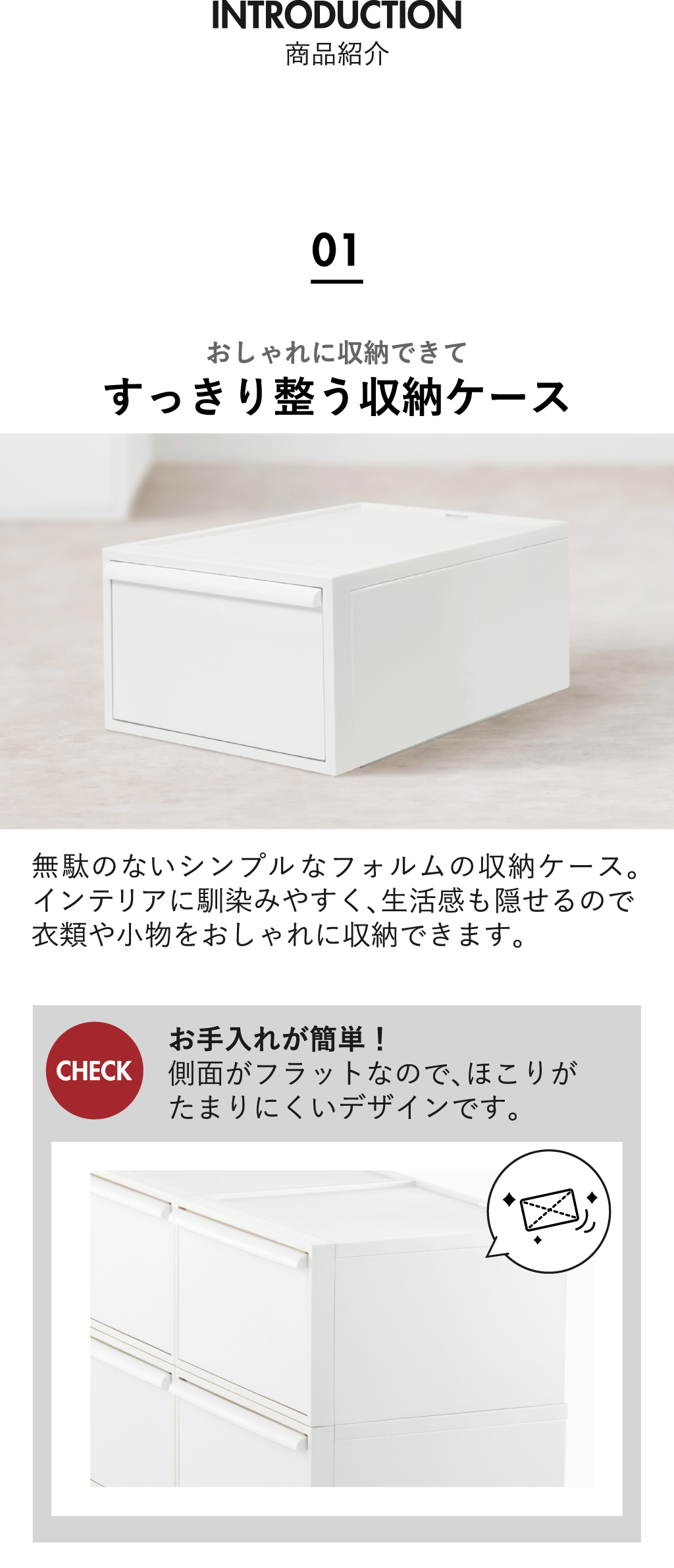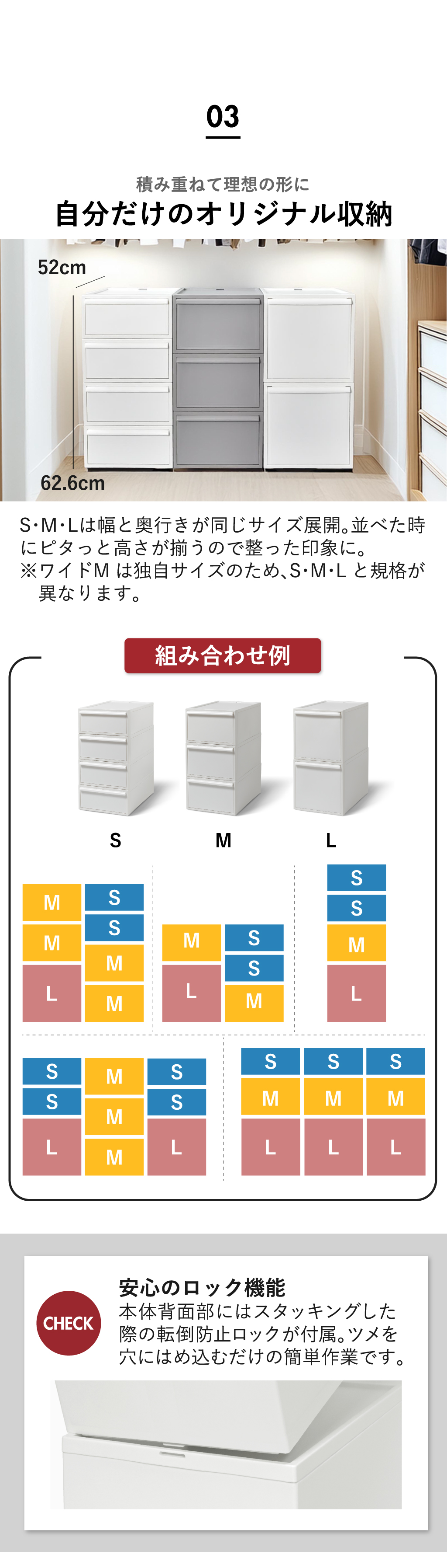 インテリアに馴染む無駄のないシンプルなデザインの収納ボックス。マットな質感で中が透けないので、見られたくない物や生活感がでるものを隠して収納できます。4個組のS、3個組のM、2個組のL、さらにたっぷり収納できる3個組のワイドMの4種類展開。S・M・Lはそれぞれセットで並べて使っても高さは同じなので、スッキリ収納できます。また、異なるサイズ同士でもスタッキングでき、高さも揃うので、収納する物や使う場所に応じて自分好みの収納空間を作り出すことができます。クローゼットに程よく収まるサイズ感でお部屋に置く際も圧迫感なく設置できる収納ボックスです。本体背面部には積み重ねた際の転倒防止としてロック機能が付属。最後まで引き出しても抜け下りないストッパー機能も付いているので安全性抜群です。収納ボックス本体の変形を防ぐため、枠に頑丈な素材を使用。スタッキングしたり天板に物を置いてもたわむ心配はありません。