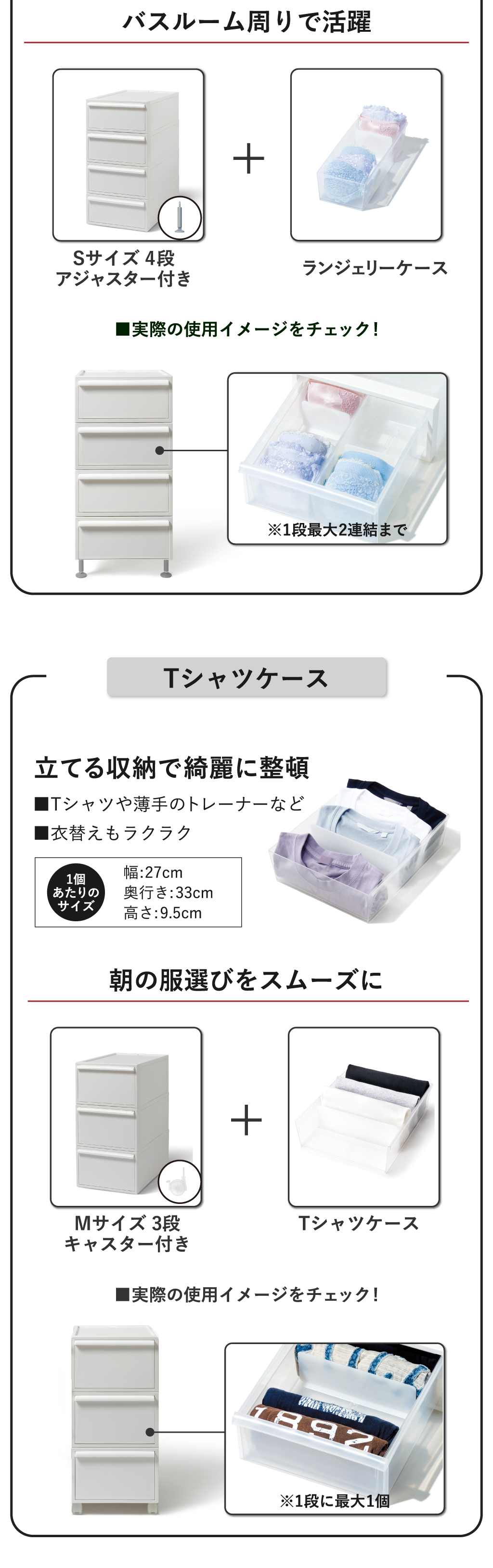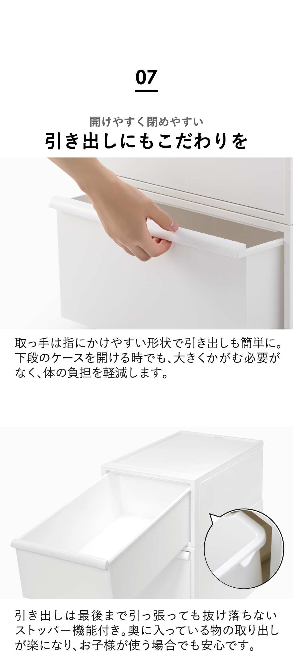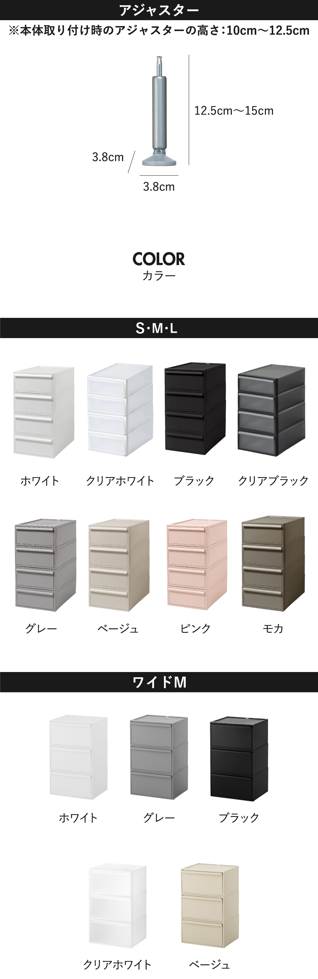 インテリアに馴染む無駄のないシンプルなデザインの収納ボックス。マットな質感で中が透けないので、見られたくない物や生活感がでるものを隠して収納できます。4個組のS、3個組のM、2個組のL、さらにたっぷり収納できる3個組のワイドMの4種類展開。S・M・Lはそれぞれセットで並べて使っても高さは同じなので、スッキリ収納できます。また、異なるサイズ同士でもスタッキングでき、高さも揃うので、収納する物や使う場所に応じて自分好みの収納空間を作り出すことができます。クローゼットに程よく収まるサイズ感でお部屋に置く際も圧迫感なく設置できる収納ボックスです。本体背面部には積み重ねた際の転倒防止としてロック機能が付属。最後まで引き出しても抜け下りないストッパー機能も付いているので安全性抜群です。収納ボックス本体の変形を防ぐため、枠に頑丈な素材を使用。スタッキングしたり天板に物を置いてもたわむ心配はありません。