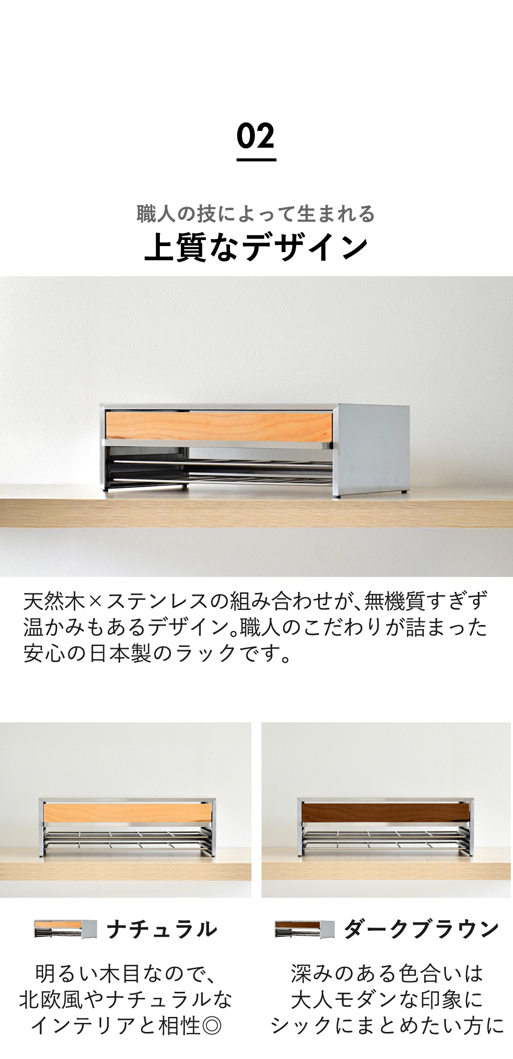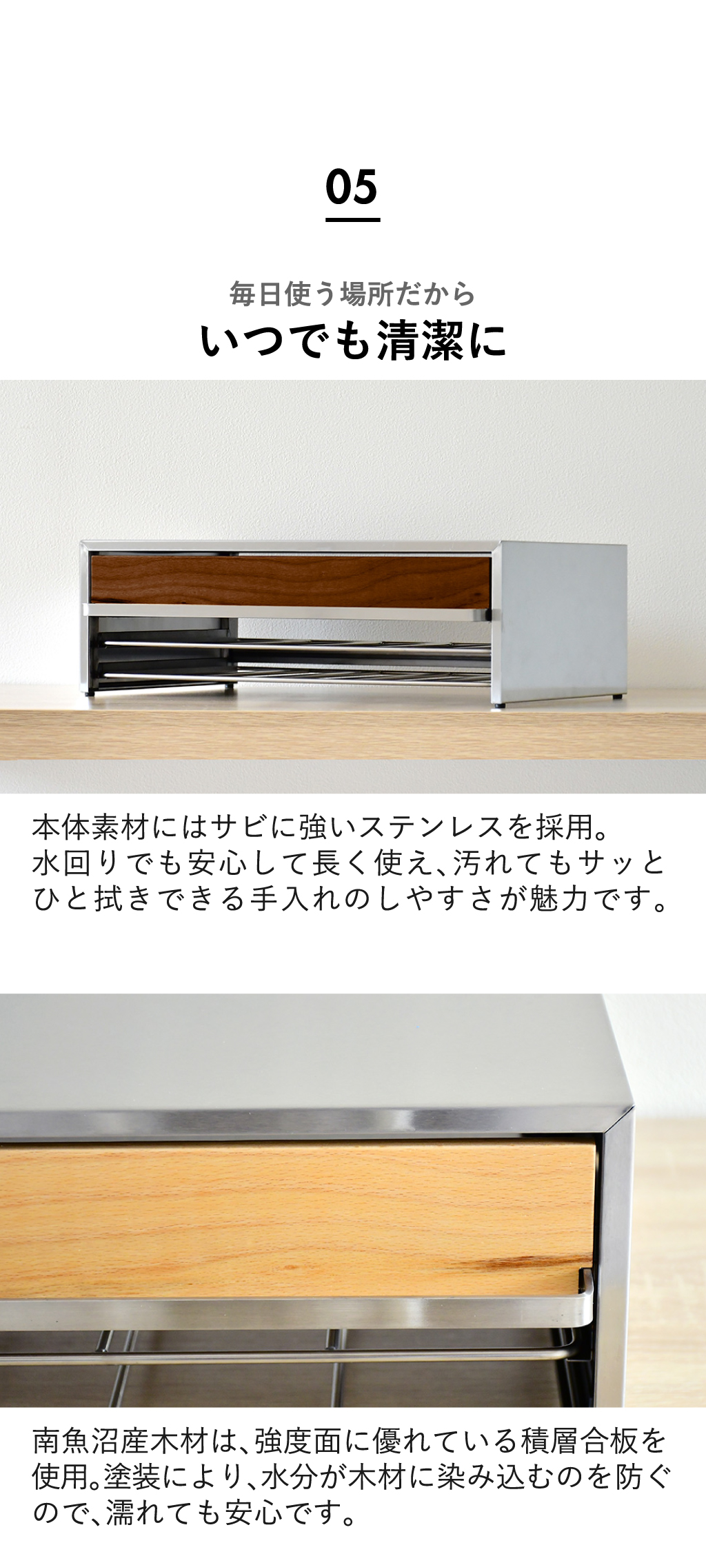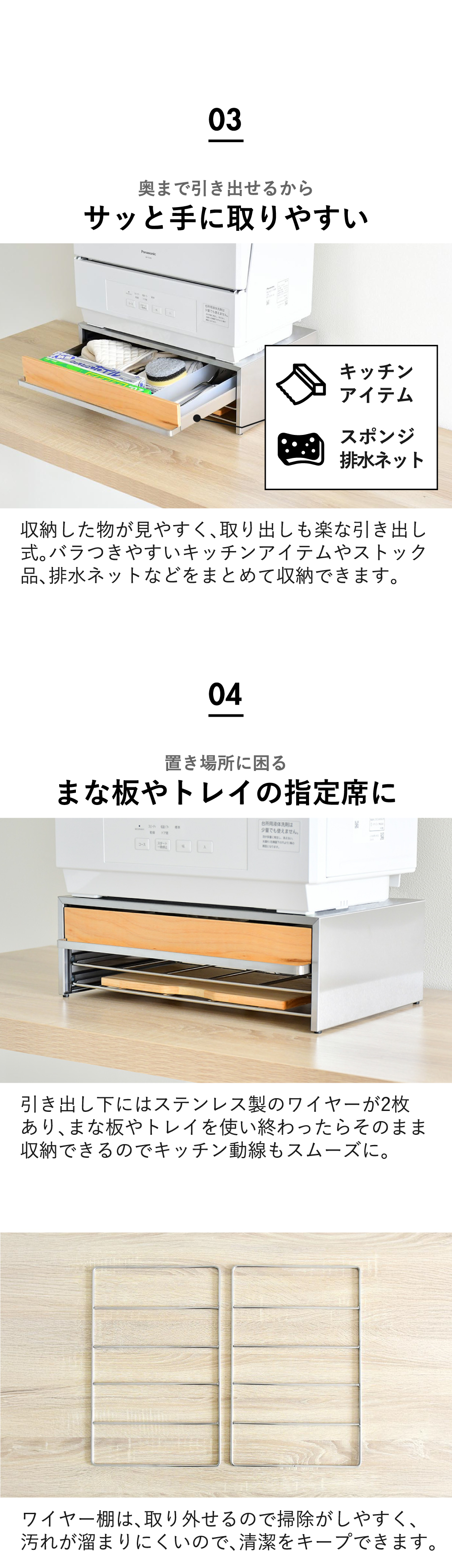 南魚沼産の天然木と、サビに強くお手入れしやすいステンレスを組み合わせた日本製のおしゃれな食洗機ラック。食洗機の下に設置することで、これまで使えなかったスペースを収納場所へ変化させます。