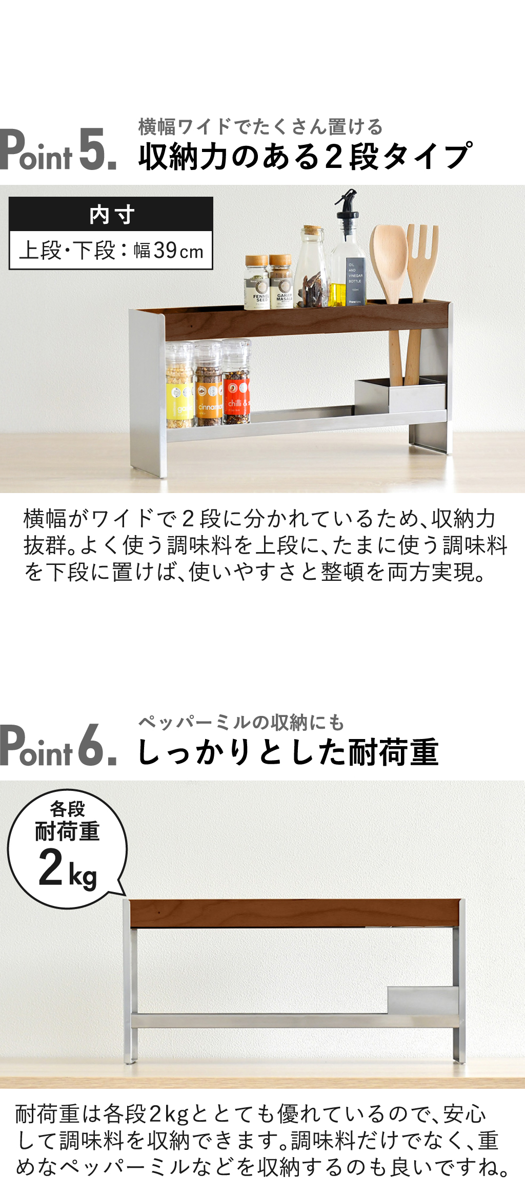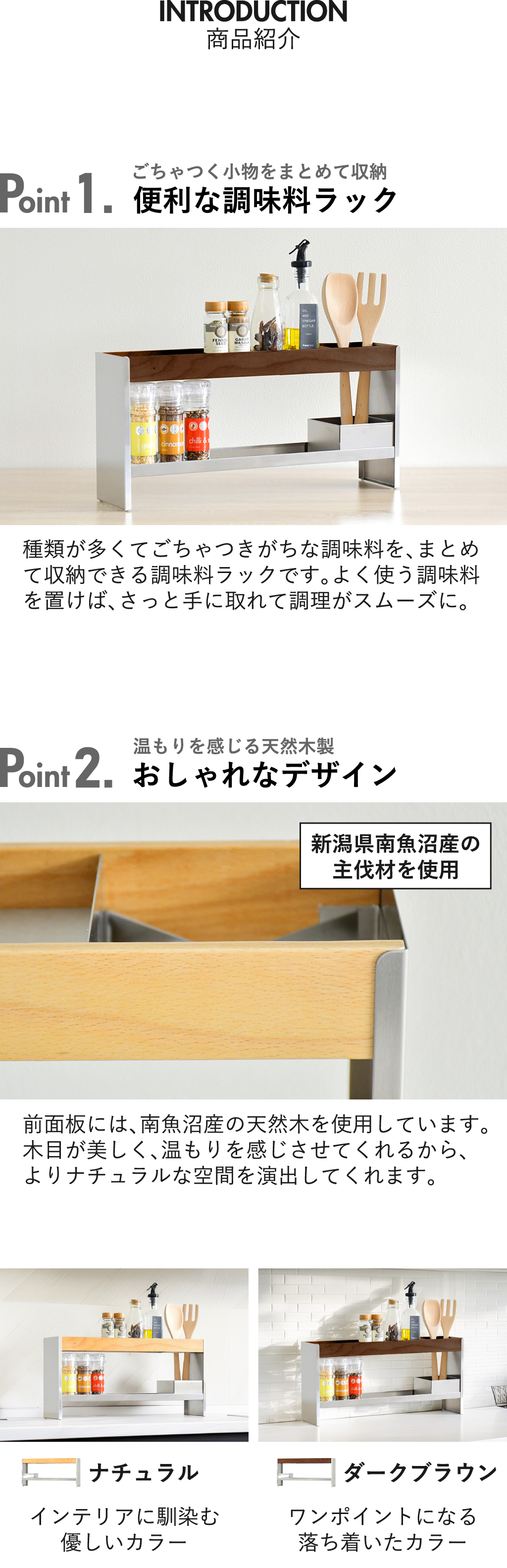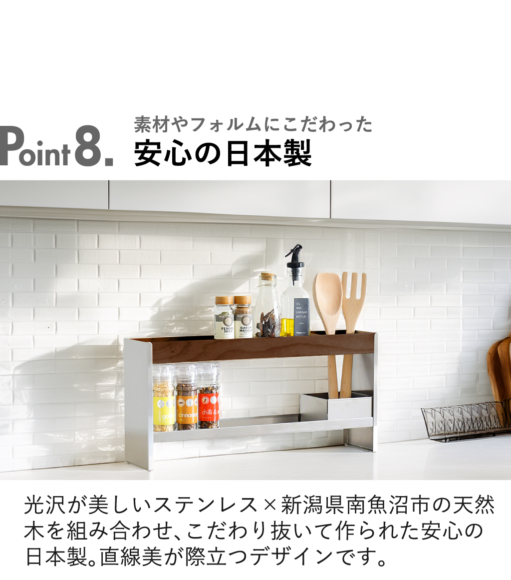 ごちゃつきがちな調味料を一括収納できる、ステンレス製の調味料ラックです。よく使う調味料を置いておくことで、使いたい時にさっと手に取れて、調理がスムーズに。調味料ラックの前面板には、新潟県南魚沼産の天然木を使用しています。木目が美しく温もりを感じさせてくれるから、よりナチュラルな空間を演出。本体は頑丈なステンレス製でサビにくく、長く使えるのが特徴です。奥行き12cmととてもスリムなので、キッチンカウンターに置いても邪魔になりません。ワイドな横幅×2段と収納力も抜群で、使いやすさと整頓を両方実現してくれます。調味料ラックの耐荷重もしっかりしていて、重めなペッパーミルなどの収納にも◎。ツール収納仕切りが付いているので、よく使うキッチンツールも一緒に収納できます。光沢が美しいステンレスと南魚沼産の天然木を組み合わせ、こだわり抜いた安心の日本製です。調味料ラックの色は、ナチュラルとダークブラウンの2色からお選びいただけます。
