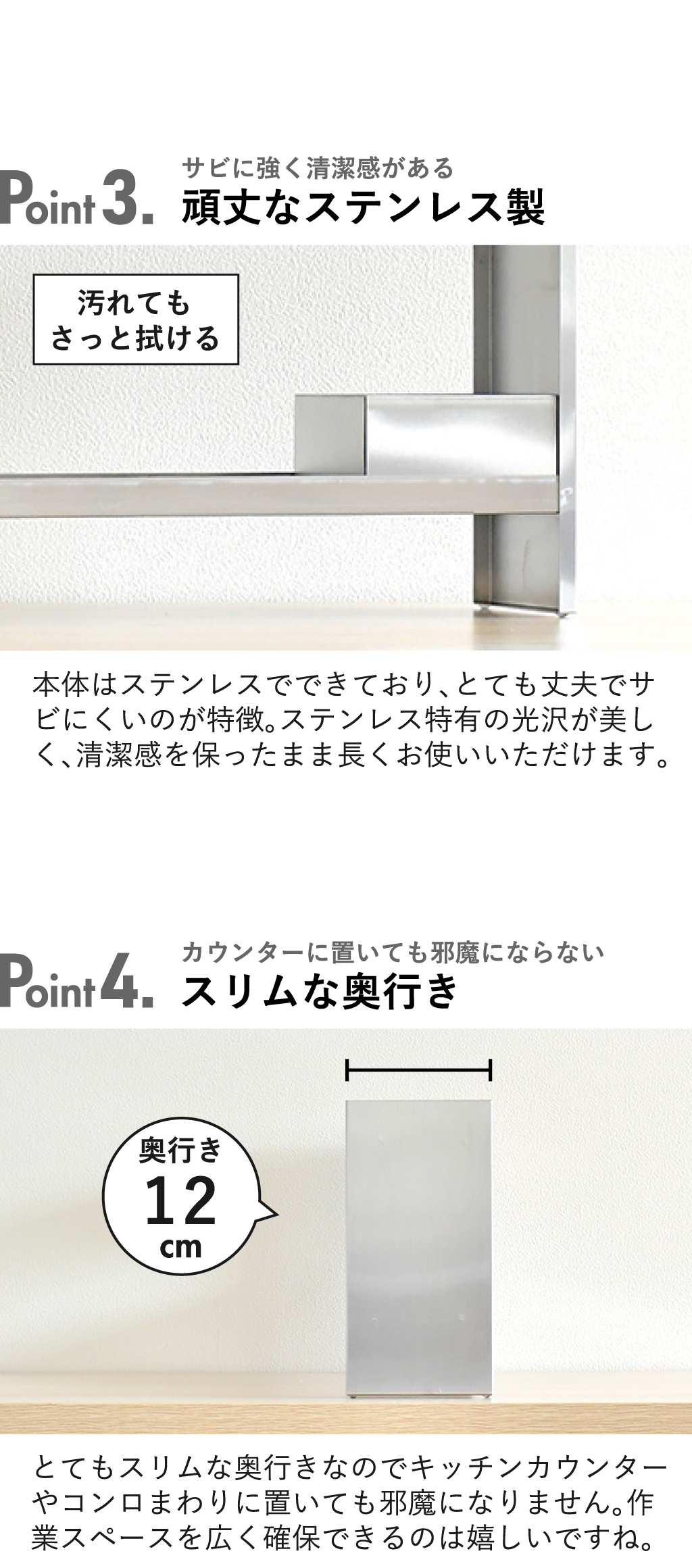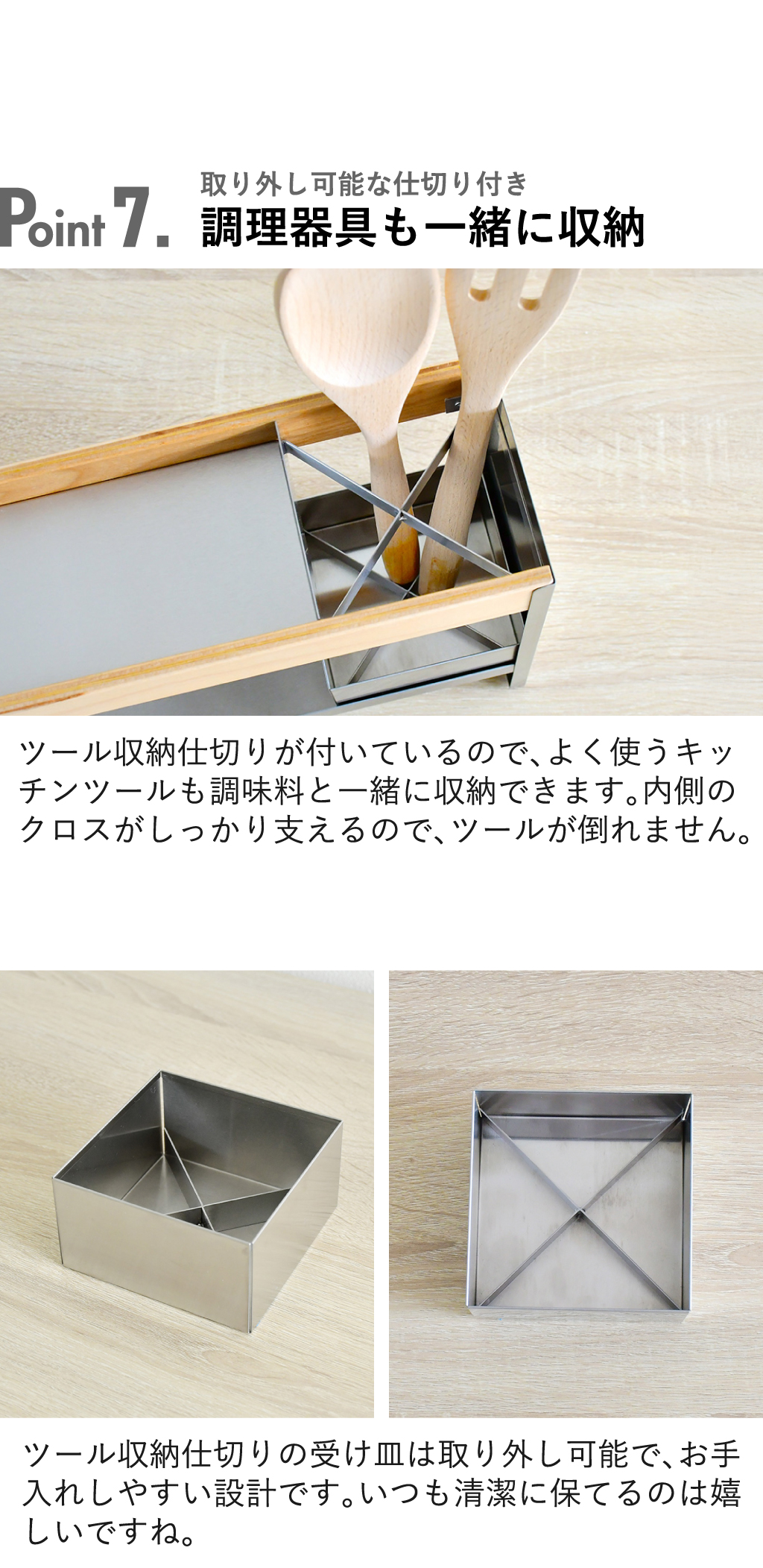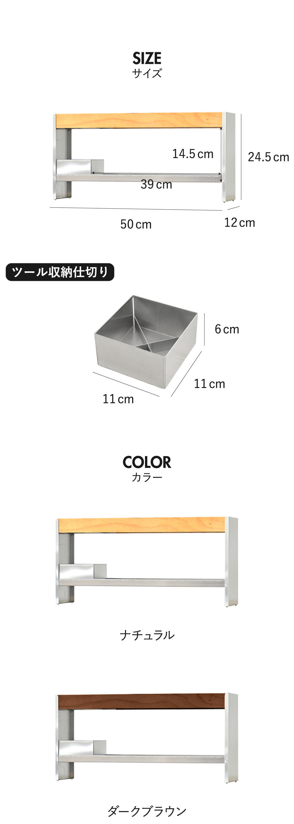 ごちゃつきがちな調味料を一括収納できる、ステンレス製の調味料ラックです。よく使う調味料を置いておくことで、使いたい時にさっと手に取れて、調理がスムーズに。調味料ラックの前面板には、新潟県南魚沼産の天然木を使用しています。木目が美しく温もりを感じさせてくれるから、よりナチュラルな空間を演出。本体は頑丈なステンレス製でサビにくく、長く使えるのが特徴です。奥行き12cmととてもスリムなので、キッチンカウンターに置いても邪魔になりません。ワイドな横幅×2段と収納力も抜群で、使いやすさと整頓を両方実現してくれます。調味料ラックの耐荷重もしっかりしていて、重めなペッパーミルなどの収納にも◎。ツール収納仕切りが付いているので、よく使うキッチンツールも一緒に収納できます。光沢が美しいステンレスと南魚沼産の天然木を組み合わせ、こだわり抜いた安心の日本製です。調味料ラックの色は、ナチュラルとダークブラウンの2色からお選びいただけます。