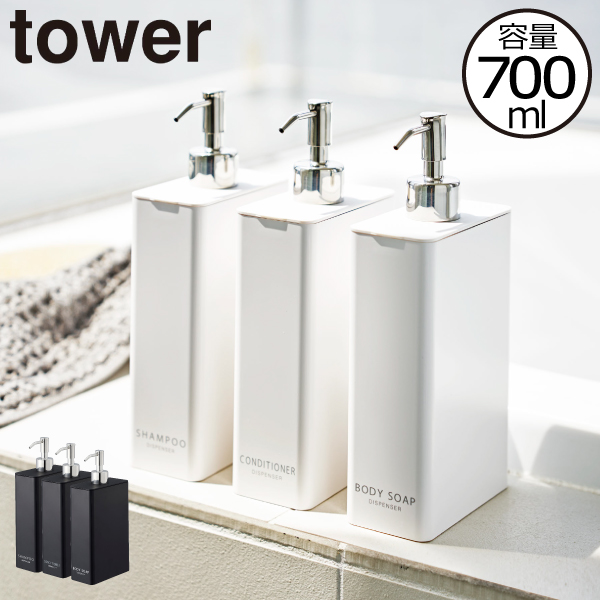 従来のソープディスペンサーがタワー商品になりバージョンアップ。無駄のないスリムでシンプルなデザインのソープディスペンサーです。洗練されたボトルは、まるでホテルのバスルームのような高級感を演出します。ボトル上部のフタがパカッと外れるので、詰め替え用袋をそのまま容器に入れて詰め替えることが可能。もちろん、液体を直接流し込んで使うこともできます。口が大きいのでこぼれる心配も少なく、ストレスフリーで詰め替え作業を行えます。フタを取り外すことができるため、お掃除しずらいボトルの中までお掃除できて便利。ボトルにはそれぞれ英字でシャンプー・コンディショナー・ボディーソープの表記があるのも嬉しいポイント。約700mlと大容量を確保しつつ、横に並べても場所を取らないのでセットで使うとよりオシャレに。色は清潔感のあるホワイトと、様々なインテリアに馴染むブラックの2色からお選び頂けます。