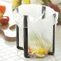 置き型の三角コーナーは、シンク内で使っているとカビやぬめりが気になってきたり、意外と場所を取って洗い物の際にも邪魔になりがちですよね。このスタンドタイプの三角コーナーは、ポリ袋を掛けるだけで、手軽に簡易ゴミ箱を作ることができます。まな板の横に置いて、調理中に出る生ゴミを捨てるのに便利です。