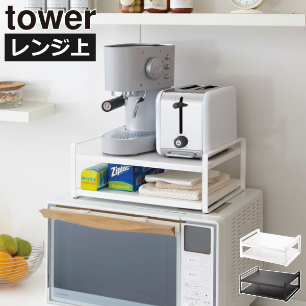レンジの上に設置して使う「レンジ上ラック tower」と、レンジを覆うように上から設置して使う「伸縮レンジラック tower」の2タイプ、「ホワイト」と「ブラック」の2色の、全4種からお選びいただけます。