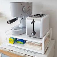 「レンジ上ラック tower」の上段には、トースターや電気ケトルなどの家電を収納することができます。空間を縦に使うことで、手狭になりがちなキッチンカウンターのスペースを、賢く有効活用。直接レンジ上に置かないから、熱くなりにくいのが嬉しいですね。