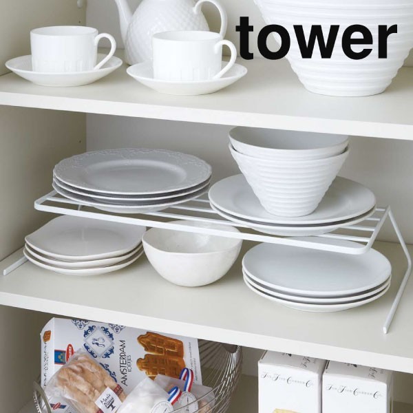山崎実業の人気シリーズ「tower」のディッシュストレージです。モノトーンなデザインの「towerシリーズ」からは、アイデアを詰め込んだ日用雑貨が数多く生まれていて、統一感もあり非常に人気があります。こちらのディッシュストレージはお皿の大きさごとに上段下段に分けて収納、食器棚と食器棚の空いたスペースを有効活用出来るので便利です。またサイズ違いの食器を重ねずに済むので、両手を使う必要のあった取り出しや収納が片手で出来てラクラクです。スチール製のフレームには水や汚れに強い粉体塗装を施しており、頑丈でサビにくい上に傷にも強くずっと綺麗なままお使い頂けます。食器棚をスッキリとさせたい方にオススメです。ポイント利用。