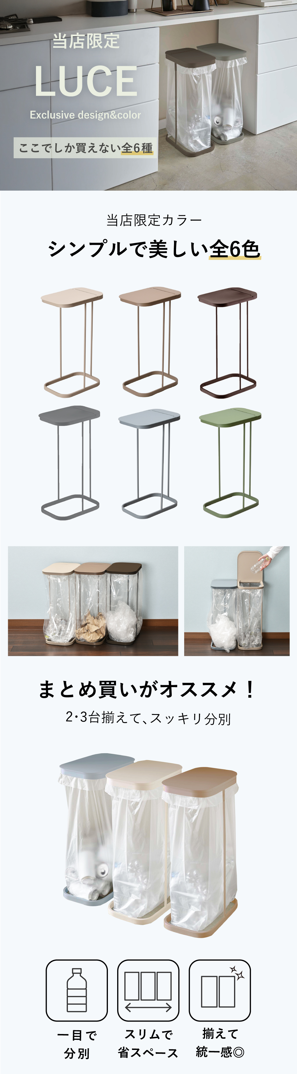 「分別ゴミ袋ホルダー LUCE( ルーチェ )」は、フタと3本のスチールフレームで作られた究極のゴミ箱。シンプルな構造なので隙間なく最後までゴミを入れられます。袋がいっぱいになったら、横から引っ張って交換。ゴミ箱の中から袋を取り出す面倒な手間が省けます。毎日使うものだからこそ、使いやすさを追求したシンプルなゴミ箱です。定番の「縦開き」・高さが制限される場所でも使える「横開き」・コンパクトサイズの「スリム」の3種類からお選びいただけます。さらに、掃除や移動に便利なキャスター付きタイプも新登場!当店限定の別注カラーと当店オリジナルゴミ箱ステッカーで、お好みのゴミ箱に。