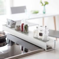 「棚付き伸縮」タイプは、よく使う調味料やスパイスを収納するのに便利な排気口カバーです。上部の棚には立ち上がりが付いているため、収納した物の落下を防いでくれます。ご家庭のコンロサイズに合わせて伸縮できるので、引っ越しなどで環境が変わっても安心です。