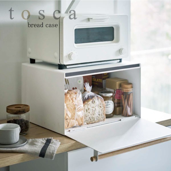 パンやこまごまとした調味料のビン等をひとまとめに・おしゃれに収納できる「ブレッドケース トスカ」です。幅43cm×奥行36.5cm×高さ24cmで、たっぷり収納できます。インテリア性の高いフラットなデザインでキッチンの雰囲気を損ないません。耐荷重量10kgのスチール製なので長期間使用してもゆがんだりせず、上にトースターや電気ケトルなどを置くことができて便利です。
