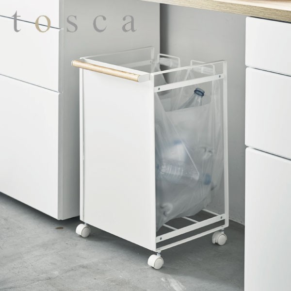 ナチュラルテイストのトスカシリーズからレジ袋を掛けて使えるダストワゴンのご紹介です。取っ手付レジ袋を複数かるだけで、1台で簡単に分別が可能です。空き缶やペットボトルなどゴミ箱に捨てると、ゴミ袋を取り出した時まだ入るスペースがあることありませんか?このダストワゴンは外枠がないので、ゴミ袋の容量いっぱいにゴミを捨てることができます。ゴミ箱と違って、汚れやゴミ箱に付くニオイなど気にすることもなく洗う手間もかかりません。また、中身も一目瞭然でフタを開けて中身を確認する必要がありません。溜まったゴミ袋は上からも横からも楽に取り出しできます。天然木の幅広い持ち手とストッパー機能付きのキャスターが付いているので、ちょっと動かしたい時などにとても便利です。底面には4本のバーが付いており、レジ袋のストック置きやレジ袋が床に触れないように支えられたりと考えられています。壁に付ければ正面の目隠しのボードでレジ袋を隠せてスッキリとした印象です。2分別タイプと3分別タイプをご用意しているのでご家庭に合わせてお選びいただけます。
