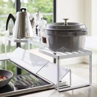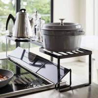 コンロ奥のデッドスペースを活かして収納できるコンロラックです。よく使う調味料や鍋を収納すれば、さっと手に取れて毎日の料理がよりスムーズになります。高さがあるから、排気口カバーの上から設置することもできて便利。約耐荷重10kgと丈夫な造りのため、鍋やケトルもしっかり置けます。格子状になった天板は通気性がよく、置き場に困る鍋蓋を差し込む形で収納することができます。熱や汚れに強いスチール製素材。汚れても乾いた布でさっと拭き取れてお手入れカンタン。色は、お部屋の雰囲気に合わせてホワイトとブラックの2色からお選びいただけます。