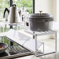コンロ奥のデッドスペースを活かして収納できるコンロラックです。よく使う調味料や鍋を収納すれば、さっと手に取れて毎日の料理がよりスムーズになります。高さがあるから、排気口カバーの上から設置することもできて便利。約耐荷重10kgと丈夫な造りのため、鍋やケトルもしっかり置けます。格子状になった天板は通気性がよく、置き場に困る鍋蓋を差し込む形で収納することができます。熱や汚れに強いスチール製素材。汚れても乾いた布でさっと拭き取れてお手入れカンタン。色は、お部屋の雰囲気に合わせてホワイトとブラックの2色からお選びいただけます。