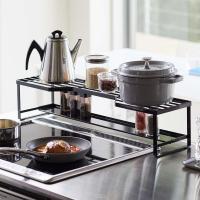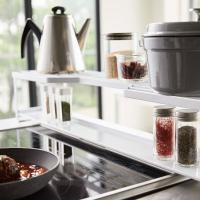 コンロ奥の空間を活かして、排気口を守りつつ収納もできるコンロラックです。排気口カバーが付いているため、調理中の油はねや食材の飛び散りから、魚焼きグリルの排気口を守ってくれます。カバーはスライド式で、グリル使用時は後ろにずらすだけ。フラットだから調味料ボトルの収納も可能。天板部分によく使う調味料や鍋を収納すれば、さっと手に取れて毎日の料理がよりスムーズに。格子状になった天板は通気性が良く、置き場に困る鍋蓋を差し込む形で収納できます。熱や汚れに強いスチール製素材で、汚れても乾いた布でさっと拭き取れてお手入れ楽々。色は、ホワイトとブラックの2色からお選びいただけます。