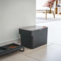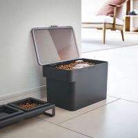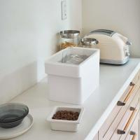 ドライタイプのペットフードをおしゃれに保存できるストッカーです。どうしても出てしまう生活感を隠し、空間をおしゃれに演出してくれます。ふたにはパッキンが付いており、湿気やニオイ漏れをしっかりガード。約3.5kgまでのドライフードを、しっかり保存することができます。持ち運びに便利なハンドル付きで、詰め替えやお掃除の際にもさっと動かせます。パーツは全て分解して丸洗いできるから、いつでも清潔に保てます。目盛りの付いた計量カップが付属しており、都度はかりを取り出す必要がありません。色は、お部屋の雰囲気に合わせてホワイトとブラックの2色からお選びいただけます。