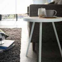 シンプルな丸型のサイドテーブル。ソファの横に設置することで、飲み物やスマホ、本を座ったまま手に取ることができ、快適です。リビングでゆったりと過ごしたい方にぴったり。