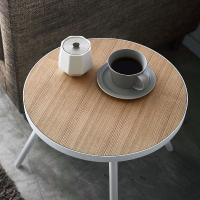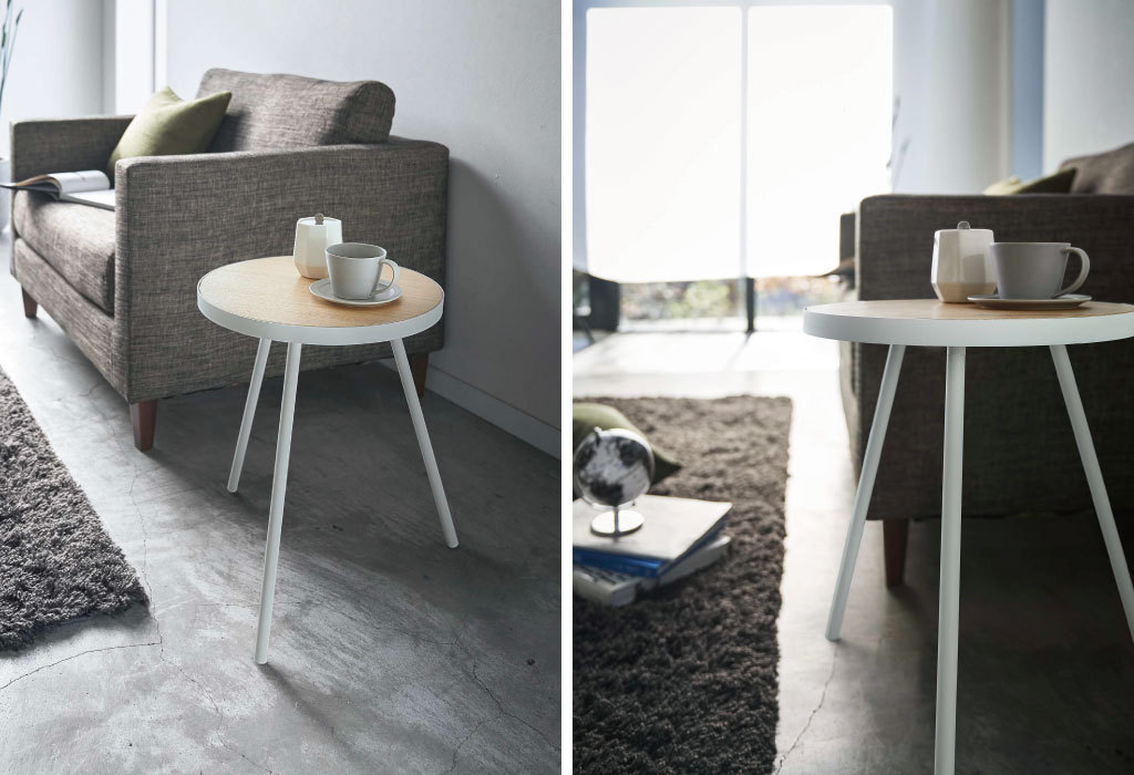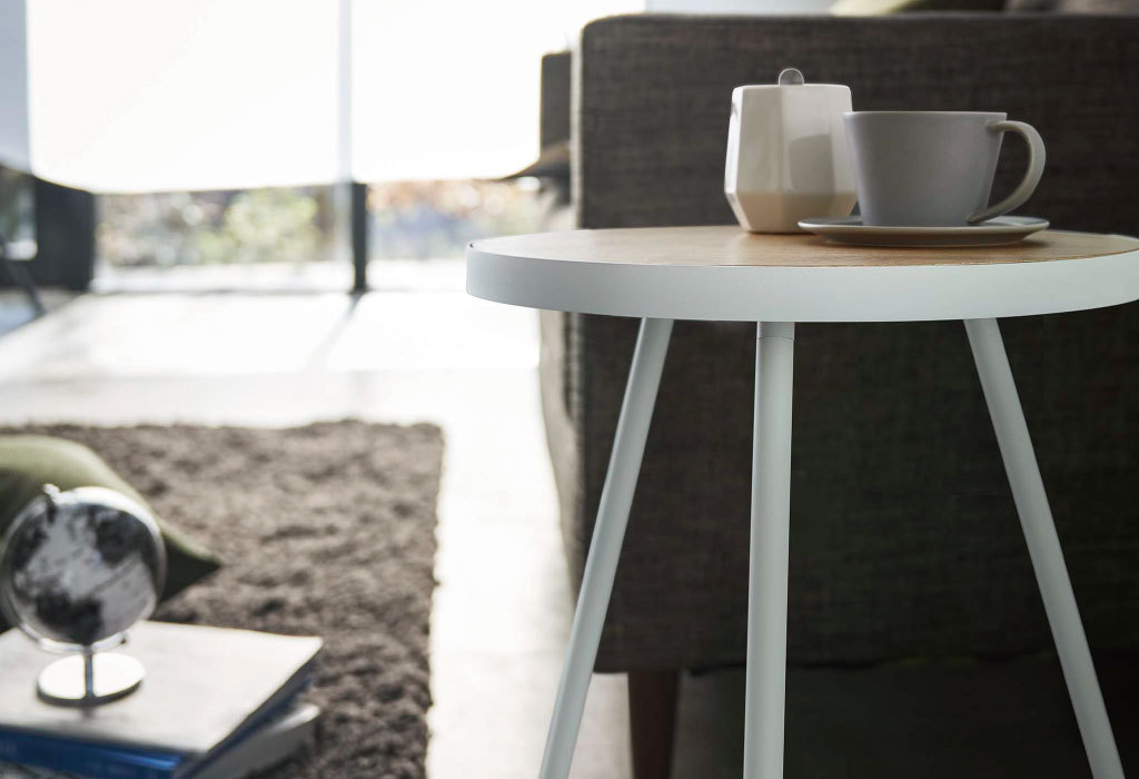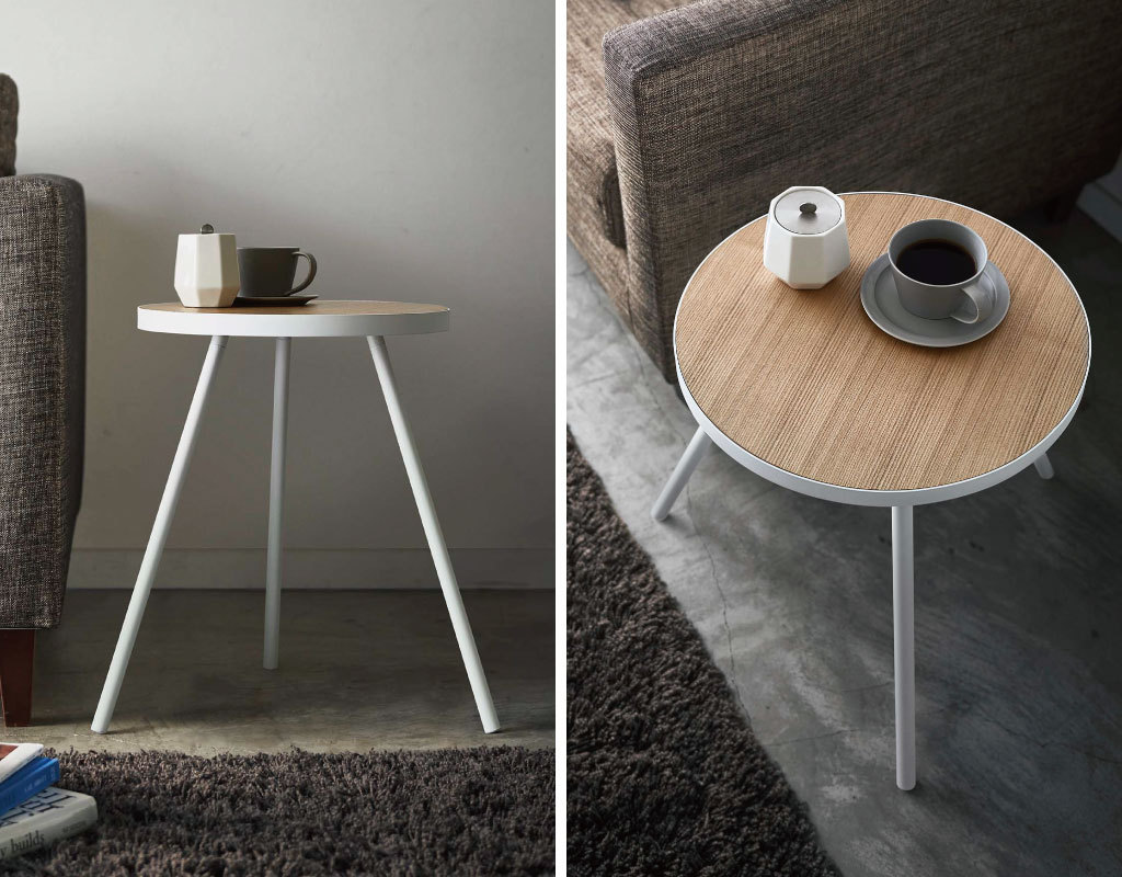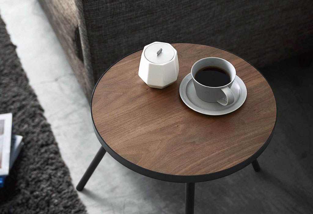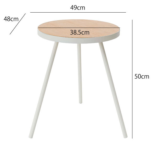 天板の直径は約38.5cm。コーヒーカップや本、スマホ、リモコンなど、リビングでよく使う小物を気軽に置けます。天板には耐水性のあるポリウレタン塗装を施しています。