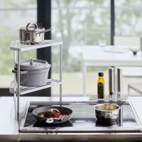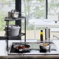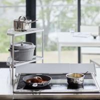 コンロ奥の空間に収納スペースを作れる、2段タイプのコンロラックです。コーナーに設置しやすい三角形のフォルムで、鍋やフライパン、調味料などの置き場として活躍。さっと手に取れて、毎日の調理がよりスムーズになります。