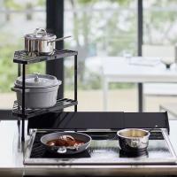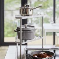 各段の耐荷重は約5kgとしっかりとした造りで、重めの鍋の一時置きも可能。2段タイプだから、複数収納できて、使い分けにも便利です。また、約奥行き22cmと広いから、フライパンなど面積の広い物も一時置きできます。