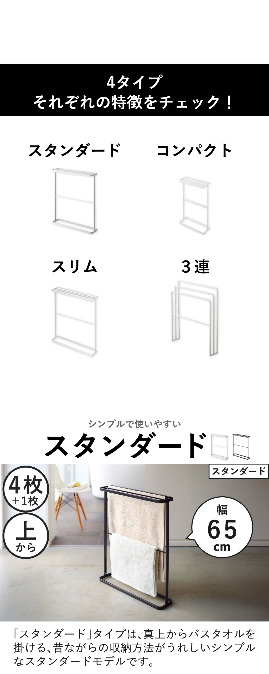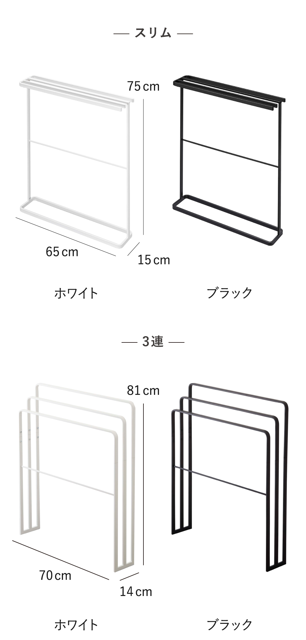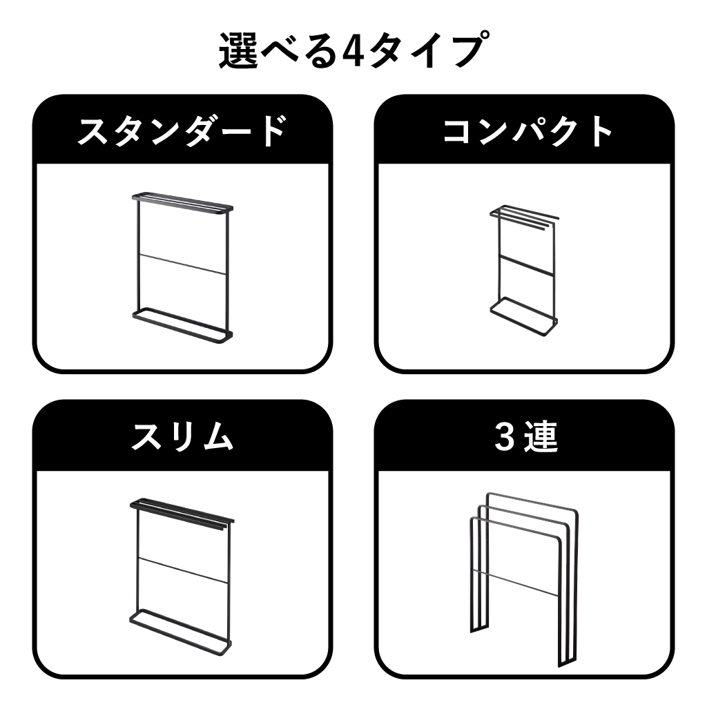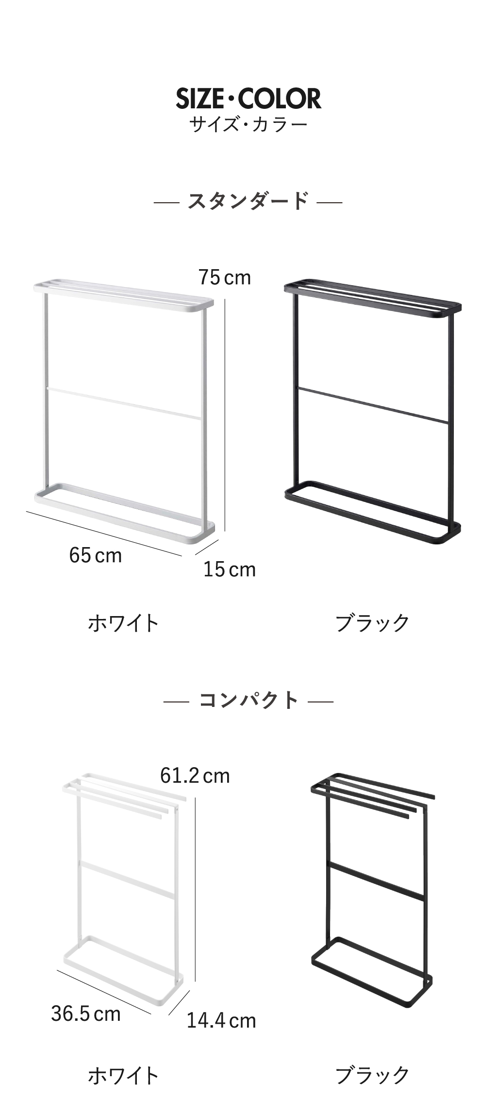タオル類を省スペース複数枚干せる、towerのバスタオルハンガースタンドです。このバスタオルハンガースタンドは、様々な空間に馴染むシンプルなデザイン。奥行きは15cm以下とスリムなバスタオルハンガースタンドなので、ランドリールームや廊下、リビングなどに置いても場所を取りません。洗濯機横などの隙間にも設置できる、省スペースなバスタオルハンガースタンドです。バスタオルハンガースタンドのバーの間隔は広いので、バスタオル同士が重なりません。通気性が良いことでタオル類がしっかり乾き、いつも衛生的に保てるのはうれしいですね。置く場所を選ばない自立タイプのバスタオルハンガースタンドなので、持ち運びも簡単にでき、使いたい場所で活躍してくれます。下段のバーには、バスマットも一緒に収納することができて便利です。バスタオルハンガースタンドは丈夫なスチール製で、より長くお使いいただけます。「スタンダード」「コンパクト」「スリム」「3連」の4タイプから、お好みで選択可能。「スタンダード」タイプは使いやすいシンプルモデルで、上から掛けられます。「コンパクト」「スリム」「3連」タイプはサイドが開いていて、横から掛けられます。バスタオルハンガースタンドは、それぞれホワイトとブラックの2色から選べます。