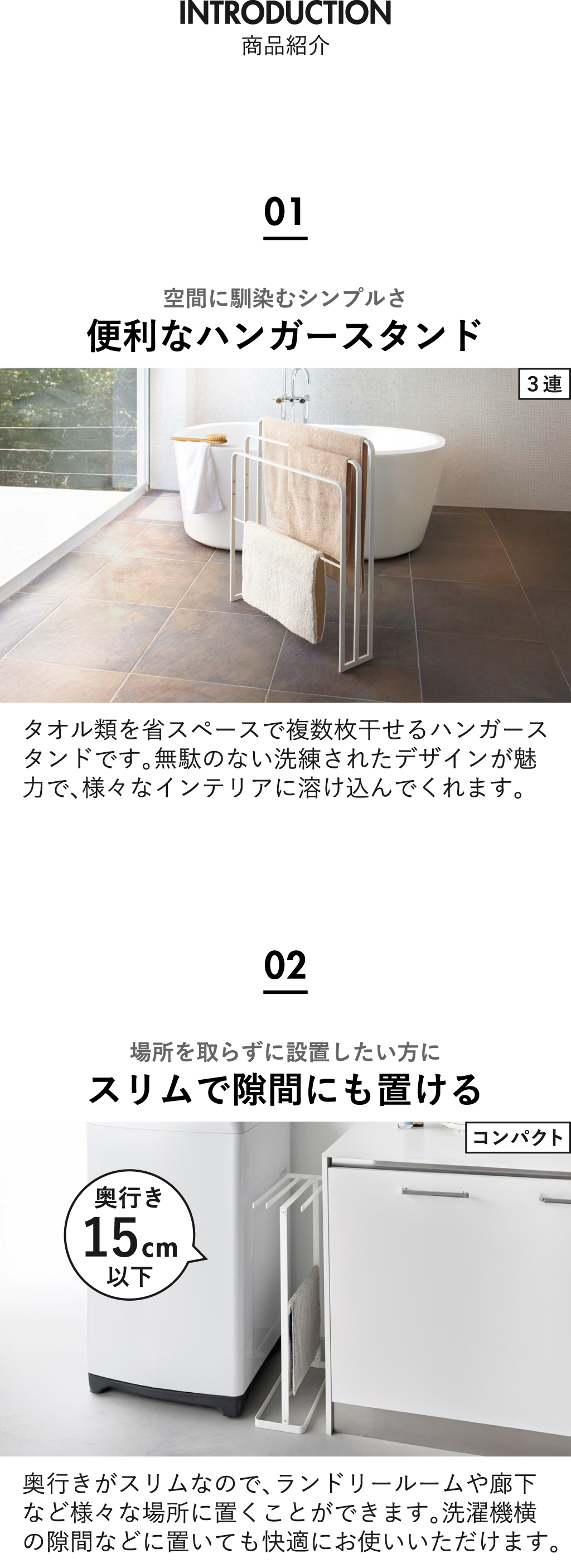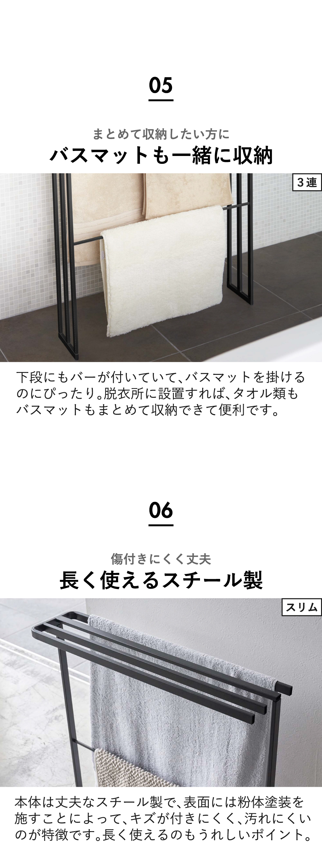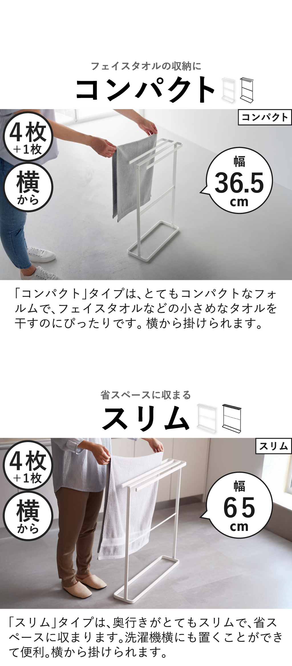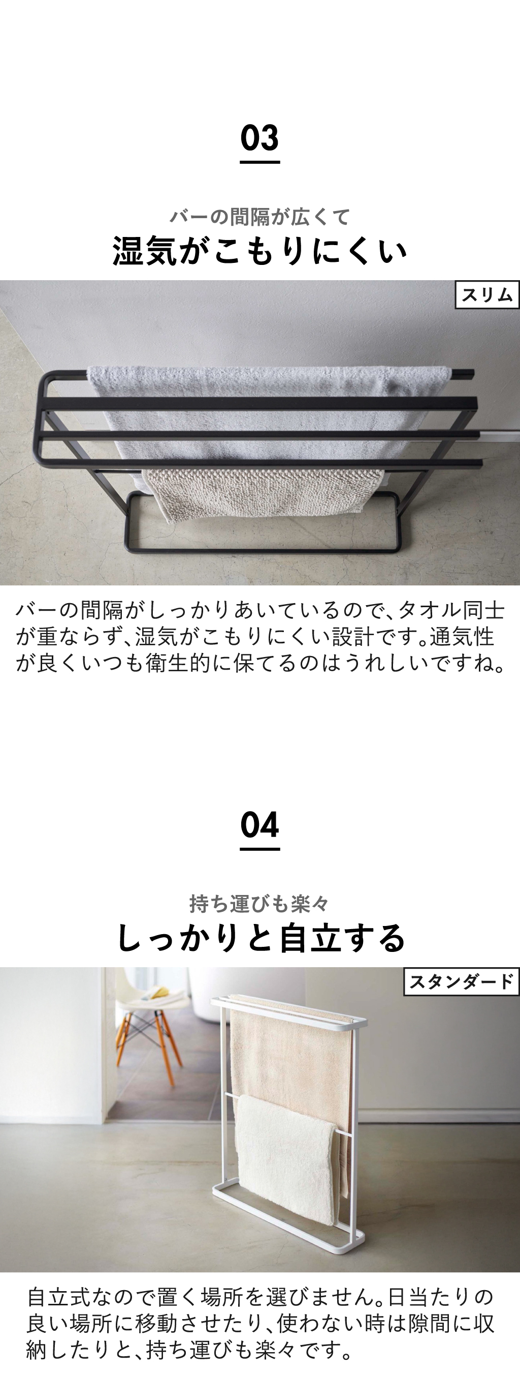 タオル類を省スペース複数枚干せる、towerのバスタオルハンガースタンドです。このバスタオルハンガースタンドは、様々な空間に馴染むシンプルなデザイン。奥行きは15cm以下とスリムなバスタオルハンガースタンドなので、ランドリールームや廊下、リビングなどに置いても場所を取りません。洗濯機横などの隙間にも設置できる、省スペースなバスタオルハンガースタンドです。バスタオルハンガースタンドのバーの間隔は広いので、バスタオル同士が重なりません。通気性が良いことでタオル類がしっかり乾き、いつも衛生的に保てるのはうれしいですね。置く場所を選ばない自立タイプのバスタオルハンガースタンドなので、持ち運びも簡単にでき、使いたい場所で活躍してくれます。下段のバーには、バスマットも一緒に収納することができて便利です。バスタオルハンガースタンドは丈夫なスチール製で、より長くお使いいただけます。「スタンダード」「コンパクト」「スリム」「3連」の4タイプから、お好みで選択可能。「スタンダード」タイプは使いやすいシンプルモデルで、上から掛けられます。「コンパクト」「スリム」「3連」タイプはサイドが開いていて、横から掛けられます。バスタオルハンガースタンドは、それぞれホワイトとブラックの2色から選べます。