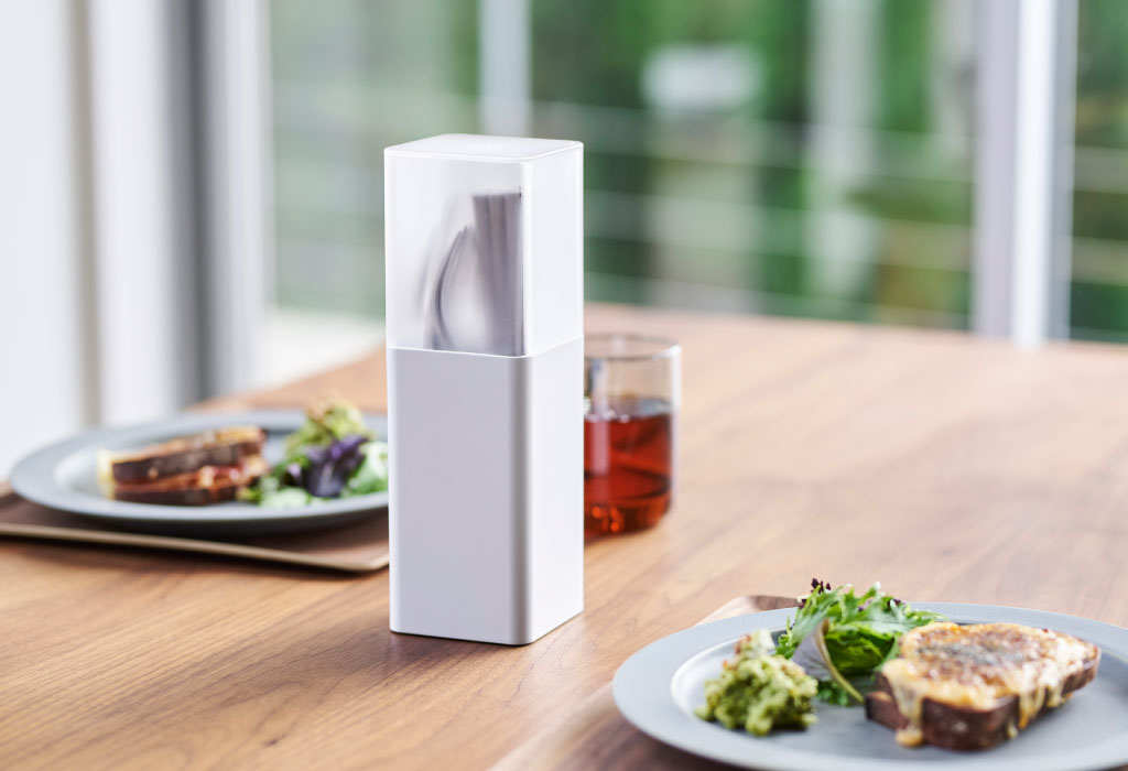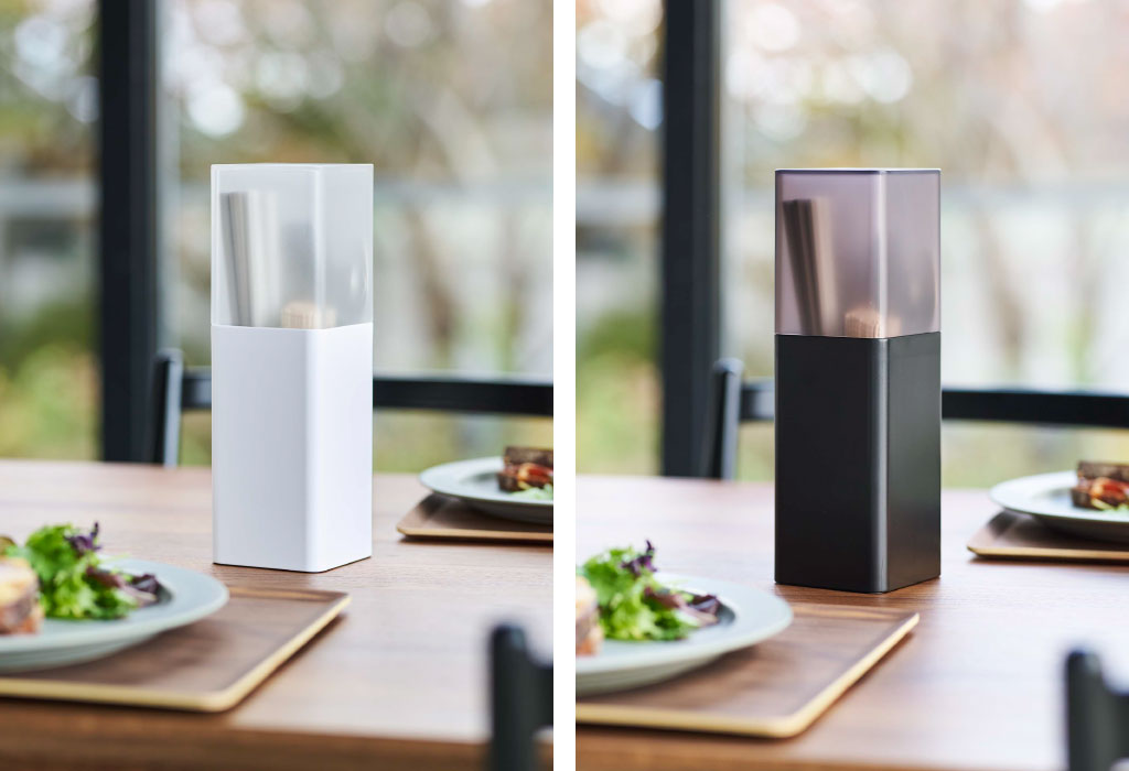 幅・奥行きともに約8cmと、とてもコンパクトなフォルム。出したままにしておいても邪魔にならない縦型だから、食器で狭くなりがちな食卓を広く使うことができます。