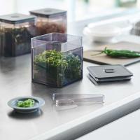 食品を湿気や乾燥から守ってくれる密閉タイプの保存容器です。薬味や調味料、作り置きなど様々な物を、新鮮さを保ったまま保存可能。一目で中身や残量が分かるクリアタイプで、管理しやすくて便利です。蓋にはバルブが付いていることで、ワンプッシュで手軽に密閉することができます。湿気や乾燥だけでなく、ニオイ漏れも防げるから、刻みネギや漬物も◎。取り分けに便利なトングが付いており、取りたい時にさっと取ることができます。トングは容器内に浮かせて収納できるから、食品に埋もれず衛生的。スタッキングできるコンパクトなスクエア型で、冷蔵庫内をより広く使えます。パーツは全て分解して水洗いできるから、いつも清潔に保てます。色は、ホワイトとブラックの2色からお選びいただけます。