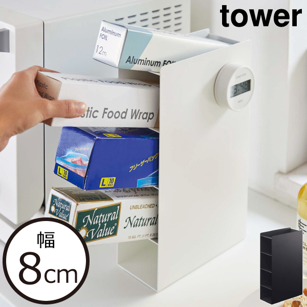 ラップ類をまとめて収納できるシンプルな収納スタンドです。様々な空間に溶け込むモノトーンのシンプルなデザイン。4段と収納力抜群で、ラップやアルミホイル、フリーザーバッグ、クッキングシートなどをすっきり収納できます。約幅8cmとスリムなので電子レンジ横やキッチンの隙間に置くことができ、場所を取りません。収納部に傾斜が付いているので収納したものを取り出しやすく、使いたいときにサッと手に取れます。本体は丈夫なスチール製。マグネットが付くのでキッチンタイマーやメモなどを取り付けられて便利です。