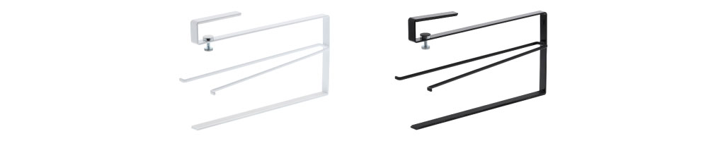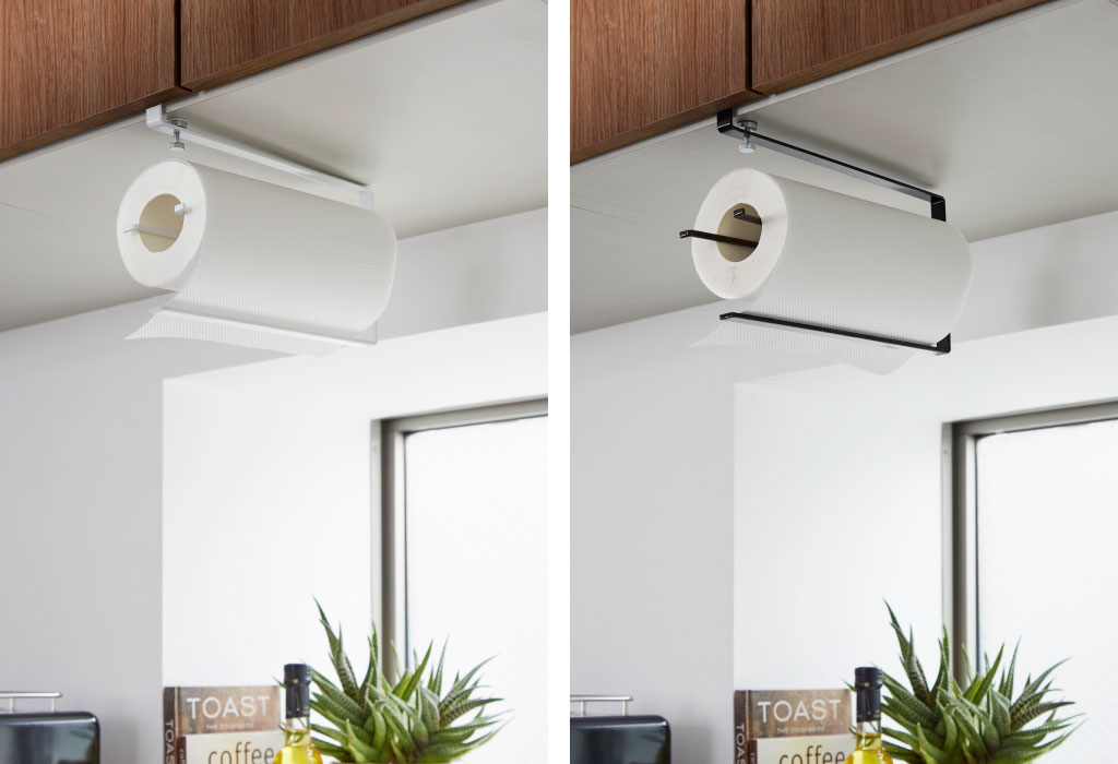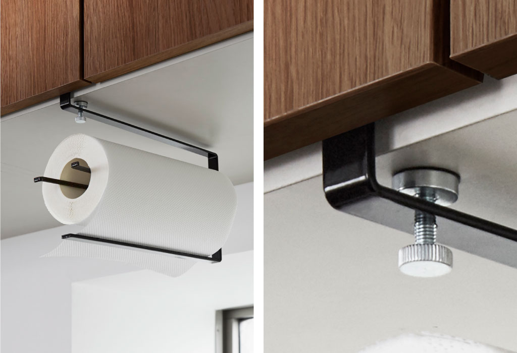 キッチンの吊り戸棚に差し込んで使える、キッチンペーパーホルダーです。デッドスペースになりがちな戸棚下の空間を、有効的に活用。設置方法は、吊り戸棚の棚板に差し込んで、調整ネジで締めるだけ。壁に穴を空けたり工具を準備する手間なく、手軽に取り付けられます。スーッと引いてさっと切るだけなので、調理中でも片手で取れます。ロールの向きを逆に取り付ければ、左利きの方にも対応できます。シリコーン製のペーパーカッターの刃が、しっかりとホールドしてくれます。本体は丈夫なスチール製で、キズやサビに強く、より長くお使いいただけます。付属の滑り止めリングを取り付けることで、空回りしないよう微調整できて便利。シンプルなデザインが様々なインテリアに溶け込み、空間をおしゃれに。色は、ホワイトとブラックの2色からお選びいただけます。