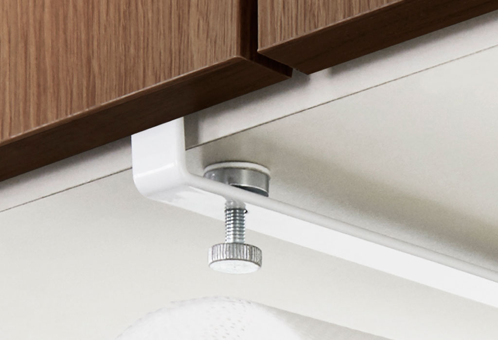 設置方法は、吊り戸棚の棚板に差し込んで、調整ネジで締めるだけ。壁に穴を開けたり、工具を準備したりする必要がなく、手軽に取り付けることができます。棚板に触れる部分にはクッションが付いているため、キズをガードできるのも嬉しいポイントです。