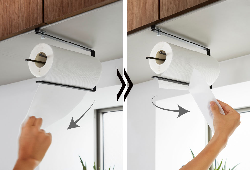 キッチンペーパーを取る時は、スーッと引いて刃に当てながら反対方向に引いて切るだけ。忙しい調理中など両手が使えない場面でも、片手でさっと取れるので、調理がよりスムーズに。また、ロールの向きを逆に取り付ければ、左利きの方にも対応することができます。