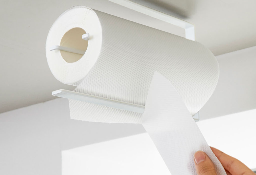 キッチンの吊り戸棚に差し込んで使える、キッチンペーパーホルダーです。意外と置き場所に困るキッチンペーパーを、吊り戸棚下のデッドスペースを活かして、スマートにセット。使いたい時にさっと手に取れるので、調理をしながらでもストレスなく使えて便利です。