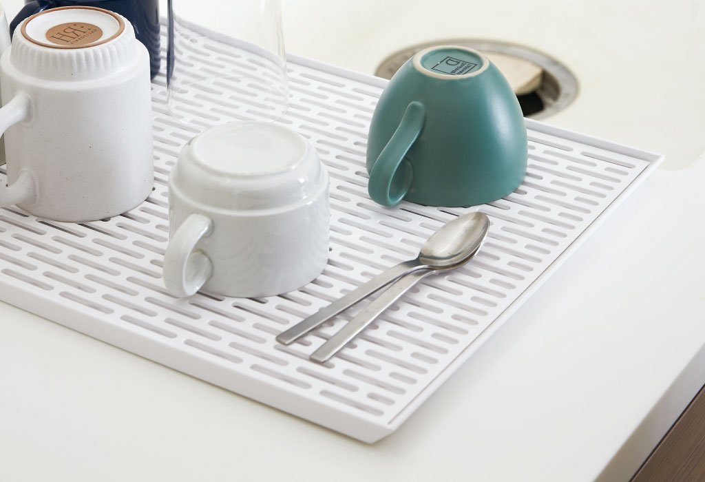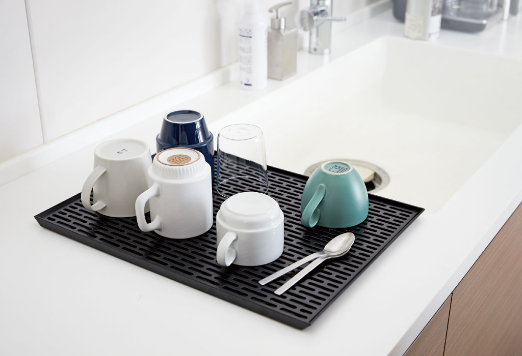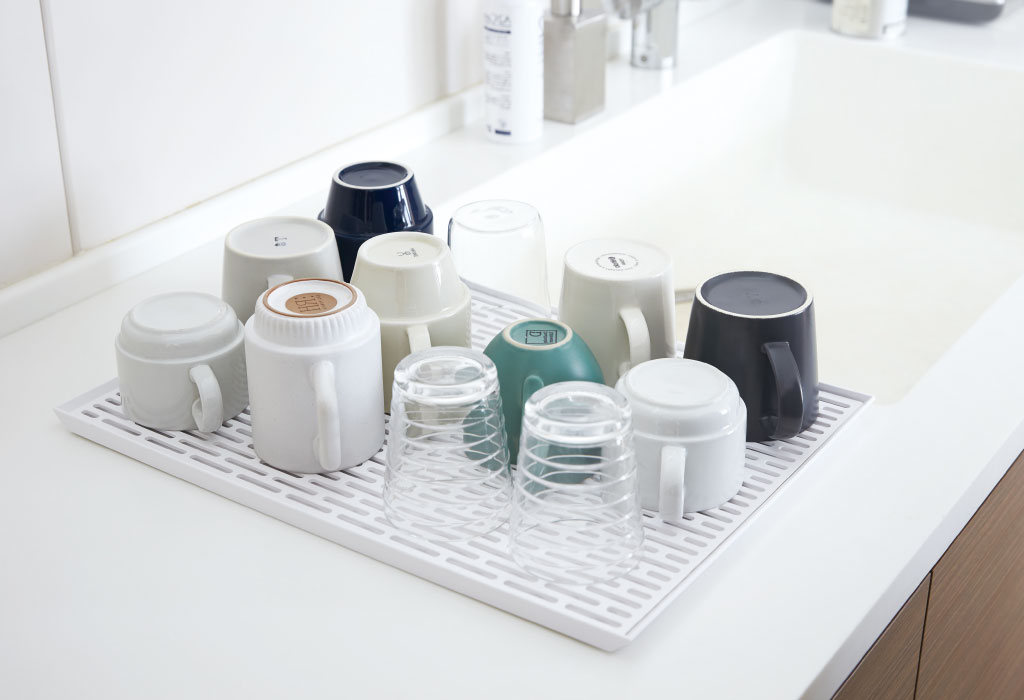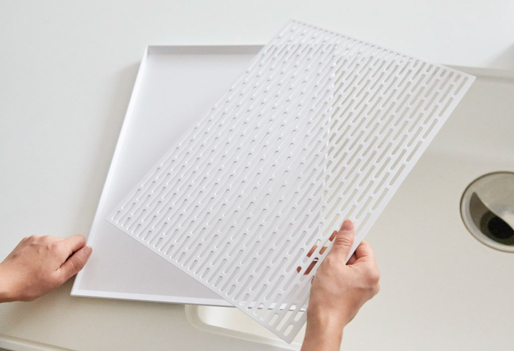 メッシュ状に穴が開いた水切り用トレー。グラスやマグカップなどとの接地面を減らし、しっかりと下に水を通し、より乾きやすくしてくれます。