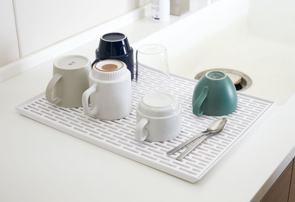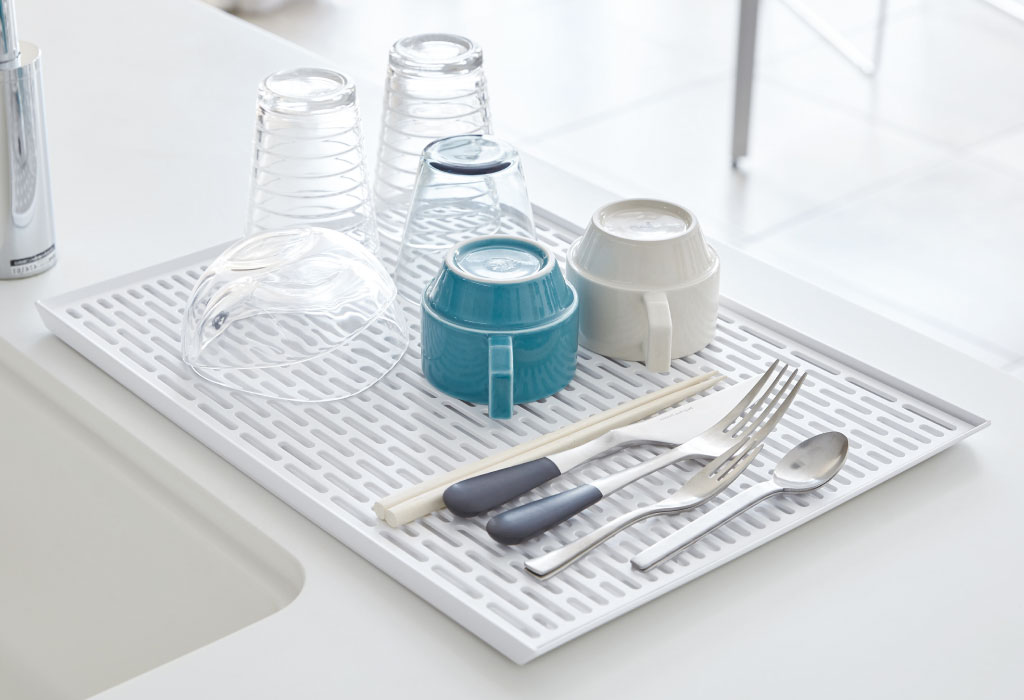 洗い物をする時だけ取り出してすぐ使える、ワイドな水切りトレーです。グラスやマグカップなどの食器を、たっぷり収納して水切りできます。清潔感のある色味と、シンプルなデザインがインテリアによく馴染み、圧迫感を与えません。