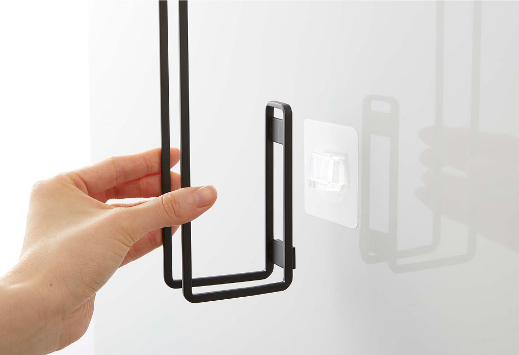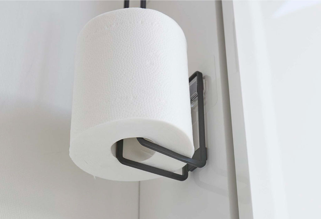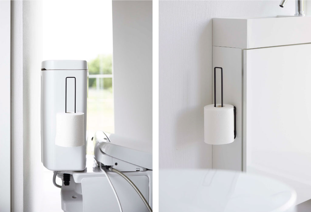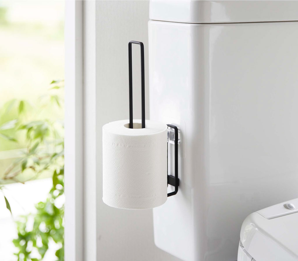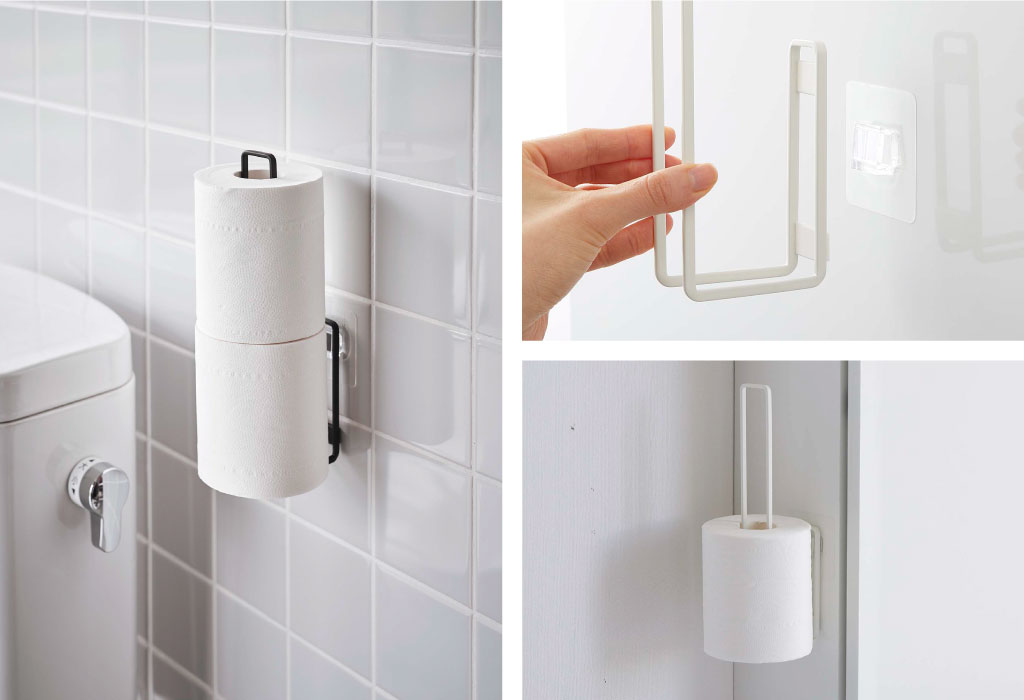 トイレットペーパーホルダーは、設置面に貼り付けてホルダーを差し込むだけで、簡単に設置することができます。また、設置可能な面はトイレのタンクやタイル壁、手洗い台など幅広く対応しています。賃貸の家でも安心してお使いいただけます。