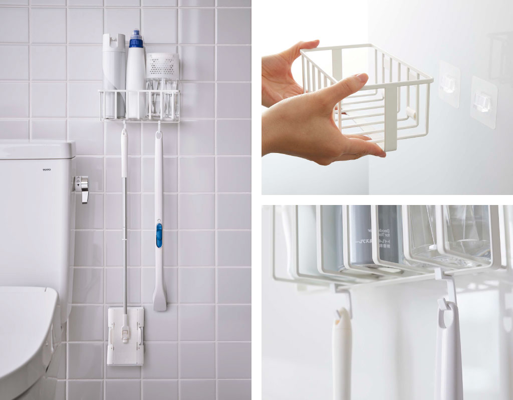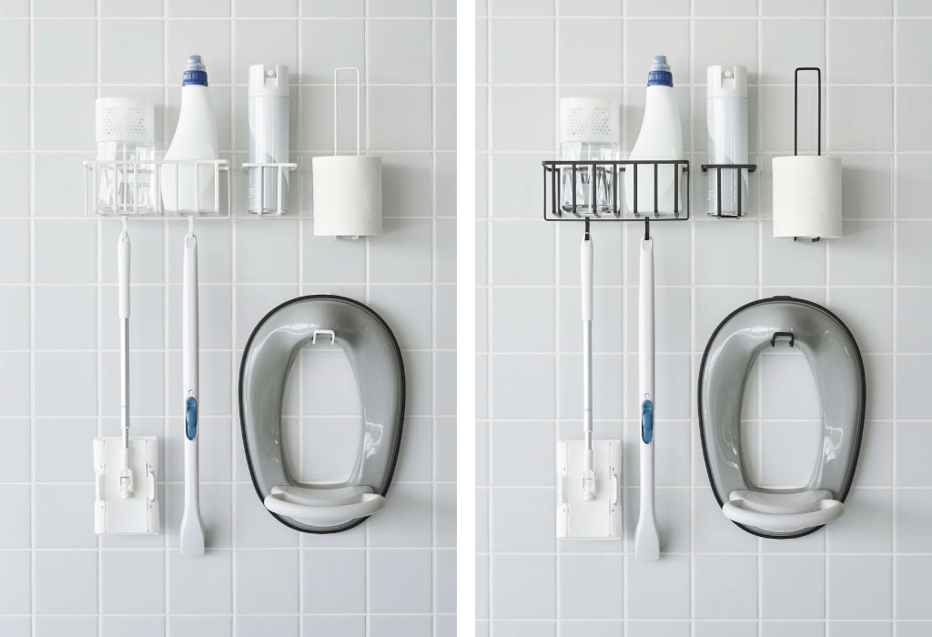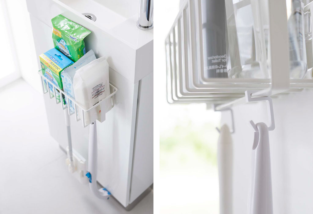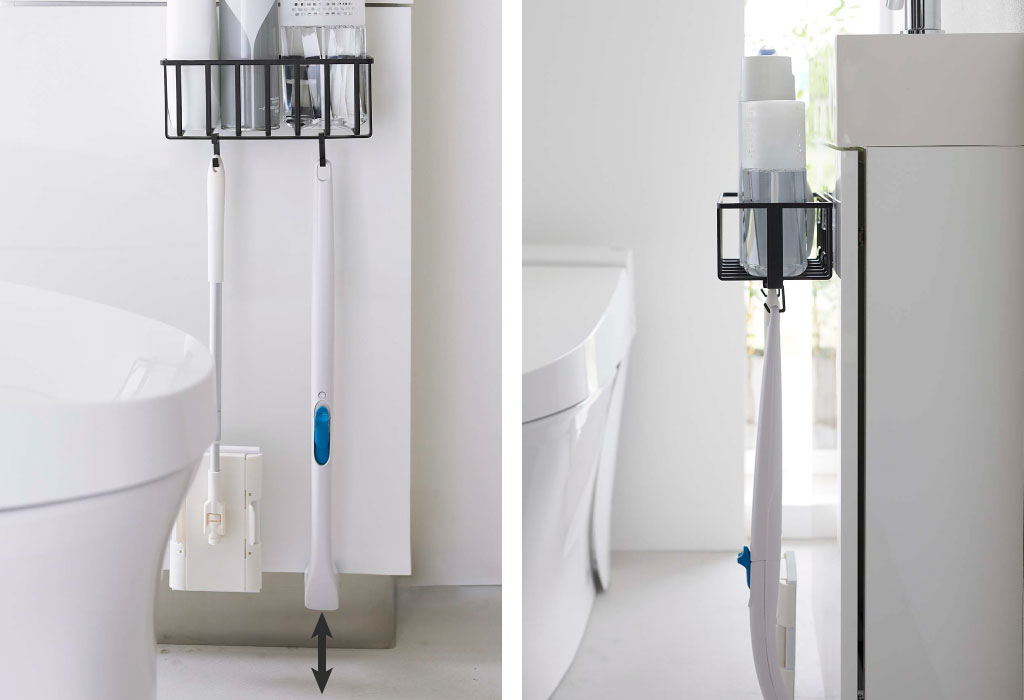 ラック下部のバーに付属のミニフックを取り付ければ、長めの掃除ブラシやフロアワイパーなども収納することができます。洗剤ボトルや取り替えブラシと一緒に収納しておけることで、トイレ掃除の手間を減らすことができて、時短になりますね。