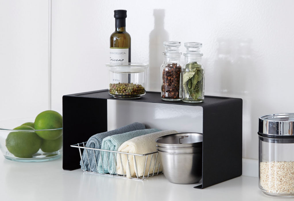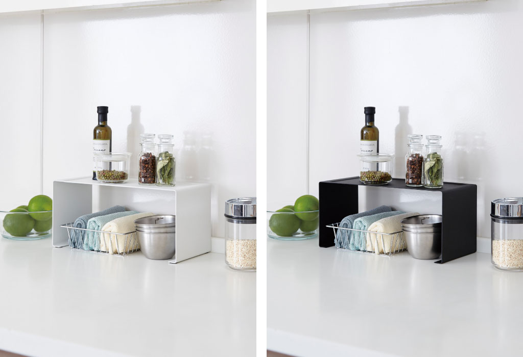 キッチンカウンター上や棚の中に置いて使える、コの字型キッチンラックです。調味料や調理器具など、物が多く散らかりがちなキッチンを、すっきりさせてくれます。場所を取らないスリムなサイズ感なので、作業スペースを広く確保できます。コの字型になっているため、天板の上下どちらにもキッチン雑貨を収納できます。そのままカウンター上や棚の中に置くだけで、手軽に収納スペースをプラス。天板にはくぼみがあり、調味料やストッカーなど、よく使う小物の収納に便利です。オープンタイプなので、使いたい時にさっと手に取れて、調理や作業がスムーズに。耐荷重もしっかりしているため、オリーブオイルなど重めの物も収納できます。2段までならスタッキングすることができるから、さらに収納力がアップします。耐久性に優れたスチール製で、キズや汚れに強く、より長く使えるのも◎。無駄のないシンプルなデザインなので、様々なキッチンに馴染んでくれます。色は、ホワイトとブラックの2色からお選びいただけます。