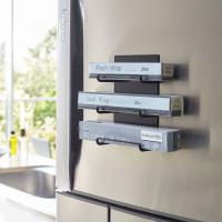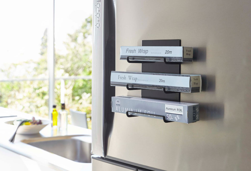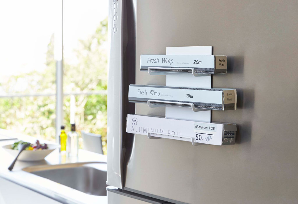 磁石のくっつく壁面にぴたっと貼って使える、シンプルなラップホルダーです。冷蔵庫やキッチンパネルなどに設置できるマグネットタイプ。置き場に困るラップやアルミホイルを、スマートに浮かせて収納することができます。