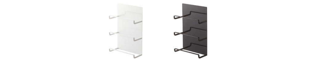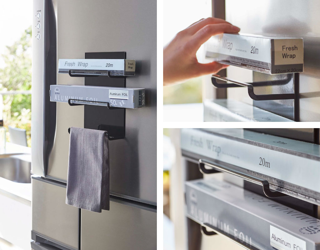 磁石のくっつく壁面にぴたっと貼って使える、シンプルなラップホルダーです。置き場に困るラップやアルミホイルを、スマートに浮かせて収納することができます。強力マグネットで、冷蔵庫やキッチンパネルなどにしっかりと固定可能。壁に穴を開けずに、手軽に収納スペースを増やせるのは、とても嬉しいですね。最大3本まで収納できるので、ラップやアルミホイルの他に、クッキングシートの収納にも◎。1段が広く設計されていることで、フリーザーバッグなどの大きめな箱も収納できます。奥行き7cmとスリムなため、冷蔵庫横などのちょっとした空間にも設置可能。ラップを上から置くだけのオープンタイプなので、収納時はもちろん、使いたい時にもさっと手に取れるので、作業がよりスムーズに。耐久性に優れたスチール製で、キズや汚れに強く、より長くお使いいただけます。フレームのみの設計なので、タオルやふきんを掛けることもできます。色は、お好みでホワイトとブラックの2色からお選びいただけます。